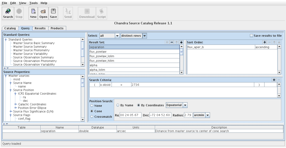 To search for these core sources, we clear our most recent query in the Query tab ("File-->New") and start a new one; we enter "o.obsid = 2736" in the Search Criteria window, the equatorial coordinates of the center of 47 Tucanae in the Cone Search 'ra' and 'dec' spaces, and 'radius= 2.79 arcmin'. The Name Resolver feature of the cone search can be used to automatically enter these coordinates by searching on the name "47 Tucanae". These conditions serve as the search criteria for the new query; they are related by "AND" search logic.