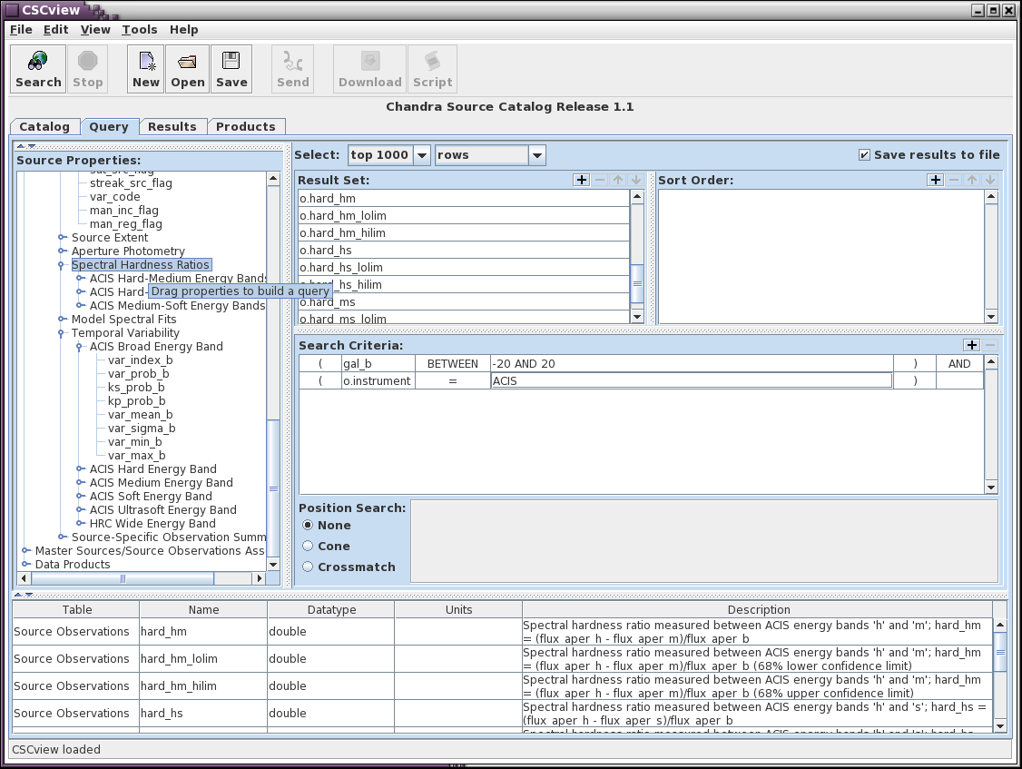 Note that this query combines properties from the Master Sources table and the Source Observation table. CSCView will automatically extend the query to include the linkage between these without requiring anything more from the user.