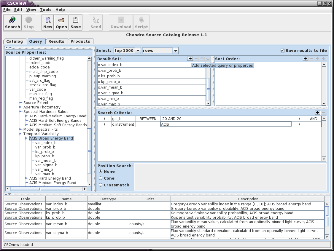 Figure 4: ACIS broad band source observation variability columns added with the '+' button.