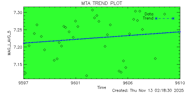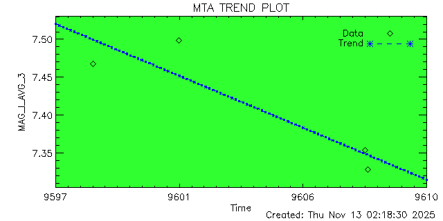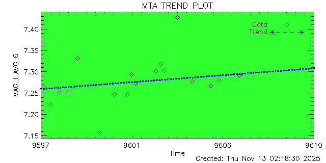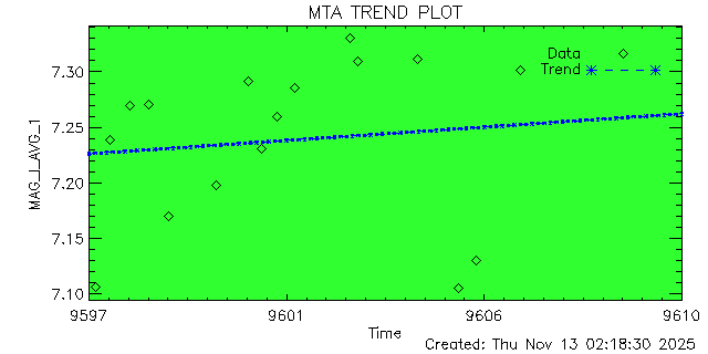 | ID | ID String | Magnitude | Data Quality (%) | Total Data | Average | Min | Max | Good | Marginal | Bad | 1 | ACIS-1 | 7.238 | 6.610 | 7.352 | 100 | 0 | 0 | 16 | 2 | ACIS-2 | 7.110 | 6.906 | 7.224 | 100 | 0 | 0 | 22 | 3 | ACIS-3 | 7.412 | 7.271 | 7.521 | 100 | 0 | 0 | 4 | 4 | ACIS-4 | 7.217 | 7.013 | 7.323 | 100 | 0 | 0 | 22 | 5 | ACIS-5 | 7.225 | 6.596 | 7.329 | 100 | 0 | 0 | 35 | 6 | ACIS-6 | 7.278 | 6.725 | 7.465 | 100 | 0 | 0 | 18 | 7 | HRC-I-1 | 0.000 | 0.000 | 0.000 | 0 | 0 | 0 | 0 | 8 | HRC-I-2 | 0.000 | 0.000 | 0.000 | 0 | 0 | 0 | 0 | 9 | HRC-I-3 | 0.000 | 0.000 | 0.000 | 0 | 0 | 0 | 0 | 10 | HRC-I-4 | 0.000 | 0.000 | 0.000 | 0 | 0 | 0 | 0 | 11 | HRC-S-1 | 0.000 | 0.000 | 0.000 | 0 | 0 | 0 | 0 | 12 | HRC-S-2 | 0.000 | 0.000 | 0.000 | 0 | 0 | 0 | 0 | 13 | HRC-S-3 | 0.000 | 0.000 | 0.000 | 0 | 0 | 0 | 0 | 14 | HRC-S-4 | 0.000 | 0.000 | 0.000 | 0 | 0 | 0 | 0 |