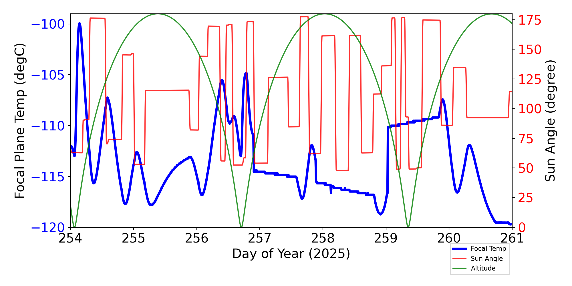Weekly focal plane temperature with sun angle, earth angle, and altitude overplotted. Sun angle is the solar array angle, that is the angle between the sun and the optical axis (+X axis). The earth angle is the angle between earth and the ACIS radiator (+Z axis). Altitude varies from 34 kkm to 128 kkm.