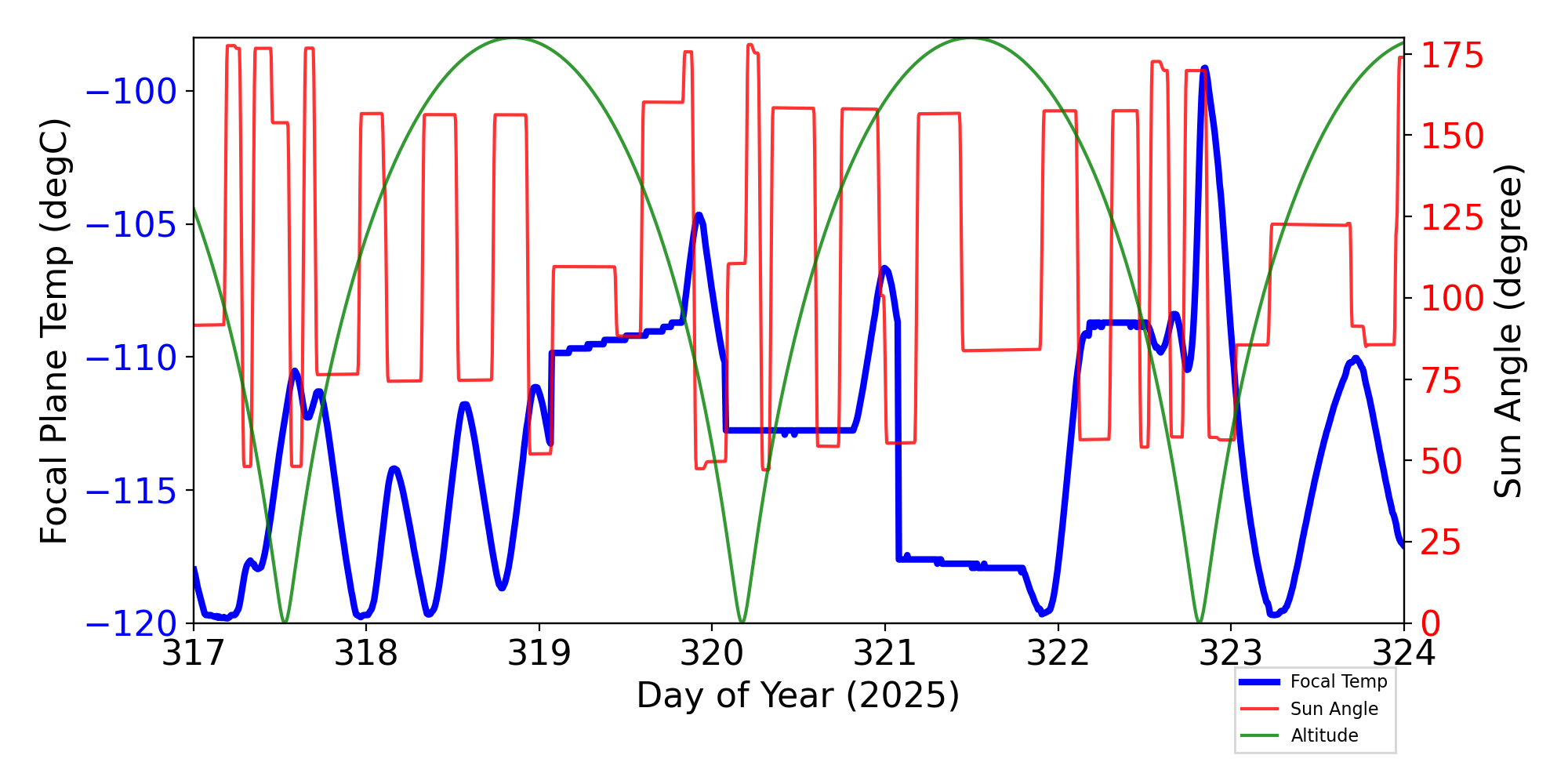 Weekly focal plane temperature with sun angle, earth angle, and altitude overplotted. Sun angle is the solar array angle, that is the angle between the sun and the optical axis (+X axis). The earth angle is the angle between earth and the ACIS radiator (+Z axis). Altitude varies from 34 kkm to 128 kkm.