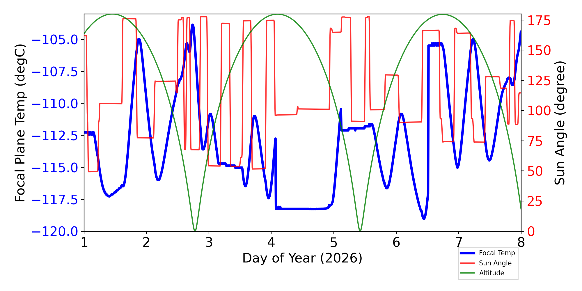 Weekly focal plane temperature with sun angle, earth angle, and altitude overplotted. Sun angle is the solar array angle, that is the angle between the sun and the optical axis (+X axis). The earth angle is the angle between earth and the ACIS radiator (+Z axis). Altitude varies from 34 kkm to 128 kkm.