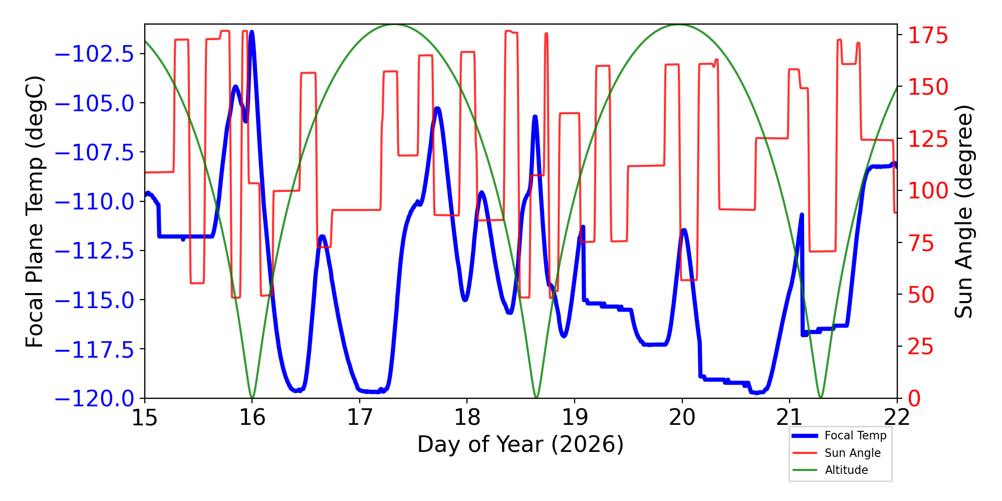 Weekly focal plane temperature with sun angle, earth angle, and altitude overplotted. Sun angle is the solar array angle, that is the angle between the sun and the optical axis (+X axis). The earth angle is the angle between earth and the ACIS radiator (+Z axis). Altitude varies from 34 kkm to 128 kkm.