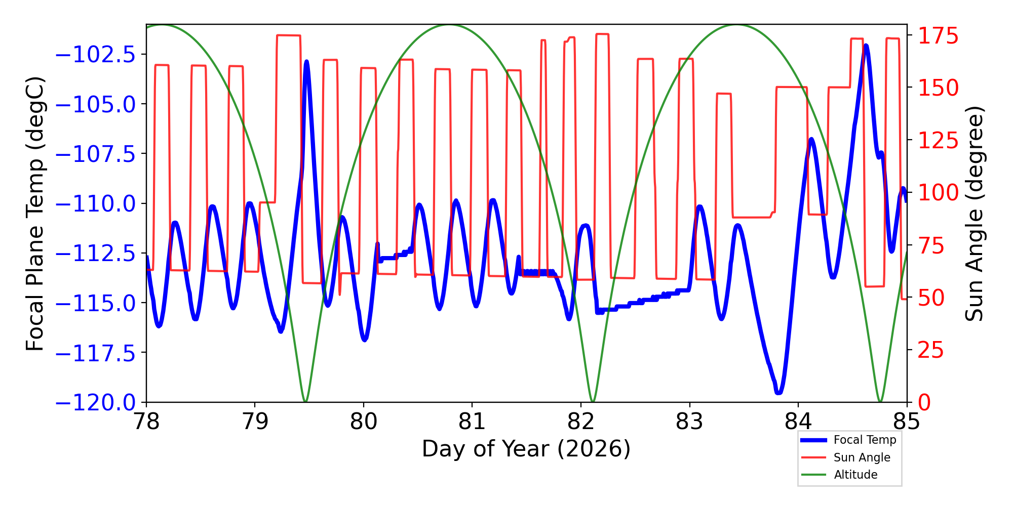 Weekly focal plane temperature with sun angle, earth angle, and altitude overplotted. Sun angle is the solar array angle, that is the angle between the sun and the optical axis (+X axis). The earth angle is the angle between earth and the ACIS radiator (+Z axis). Altitude varies from 34 kkm to 128 kkm.