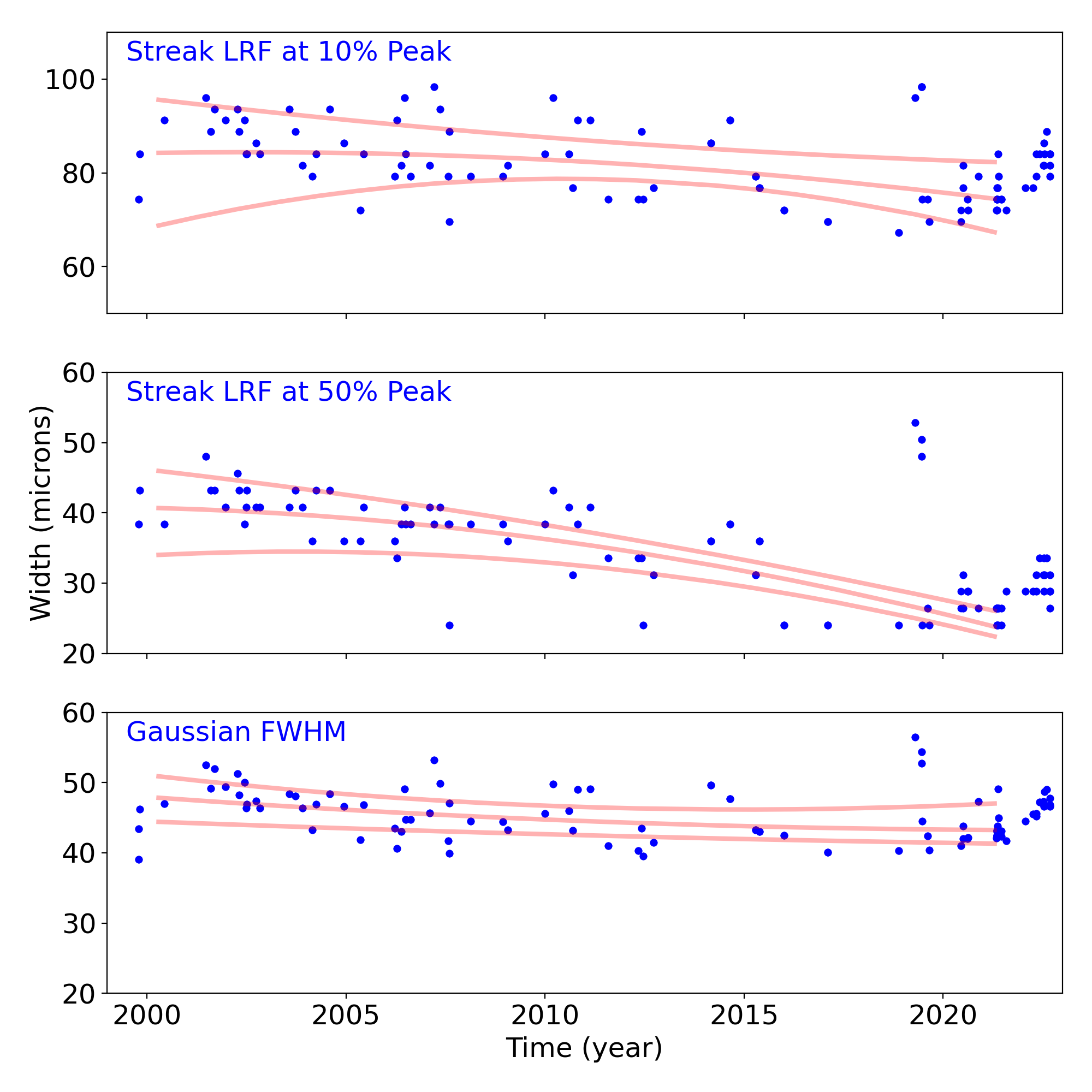 We are using 10 period moving averages to show trends of peak temperatures and peak widths. Note, the gaps in the width plot are due to missing/corrupted data.