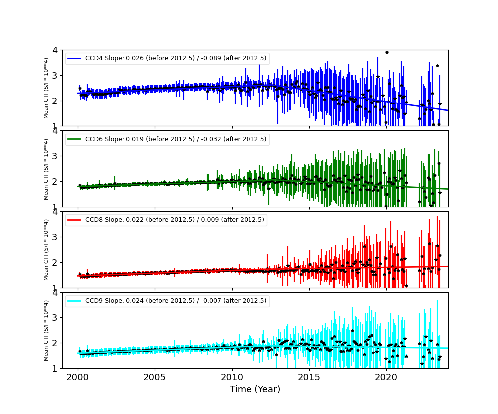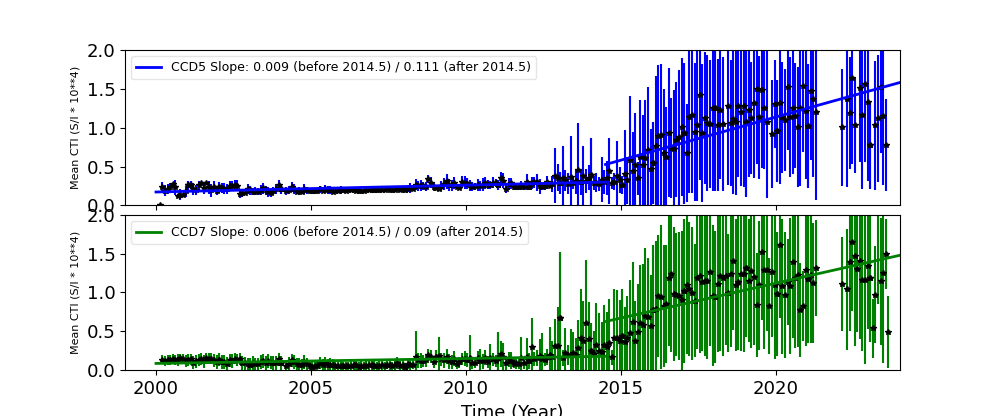 We report CTIs with a refined data definition. CTIs were computed for the temperature dependency corrected data. Please see CTI page for detailed explanation. CTI's are computed for Mn K alpha, and defined as slope/intercept x10^4 of row # vs ADU. Data file: here