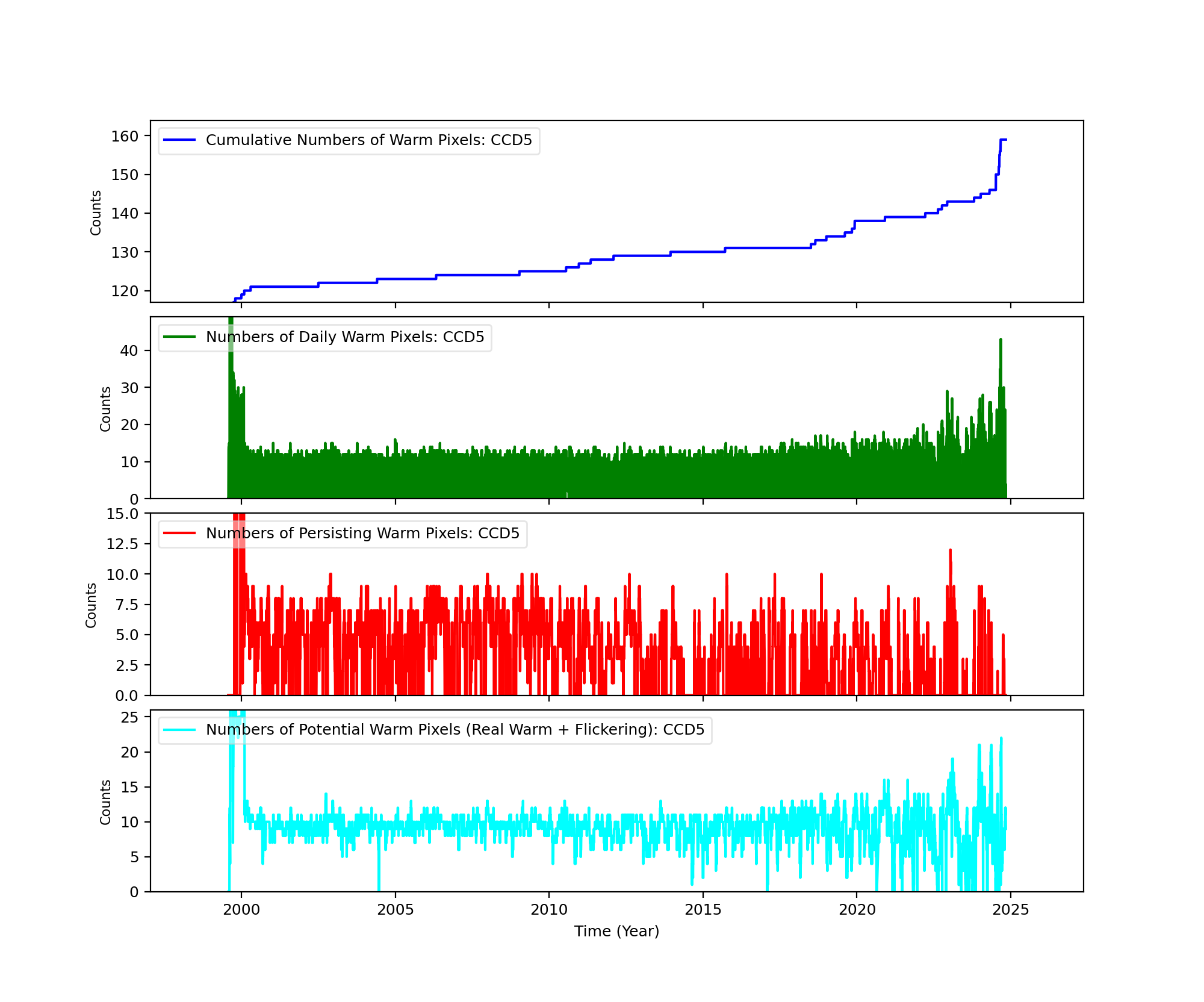The plots below were generated with a new warm pixel finding script. Please see Acis Bad Pixel Page for details.