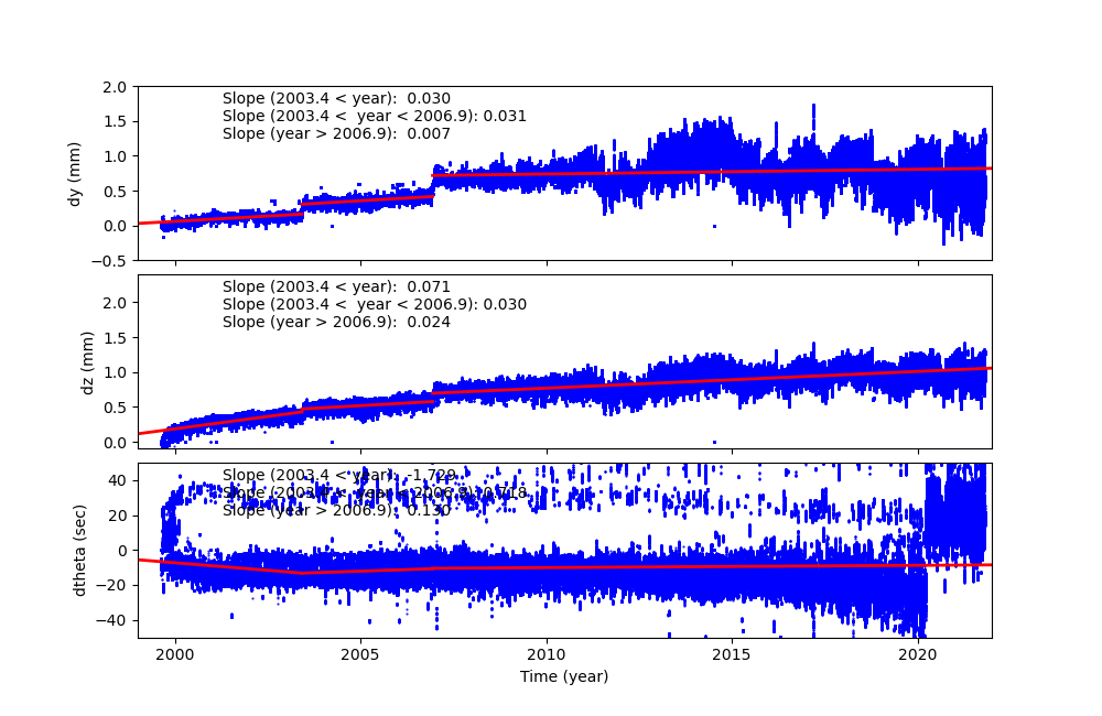 SIM Shift and Twist Trend The following plots show trends of SIM shifts (dy and dz) and twist (dtheta). All quantities are directly taken from pcaf*_asol1.fits files. The units are mm for dy and dz, and degree for dtheta. We fit three lines separated before and after (Days of Mission)= 1400 (May 21, 2003), 2700 (Dec 11, 2006), and 4400 (Aug 07, 2011). The unit of slopes are mm per day or degree per day.