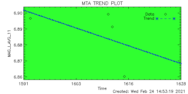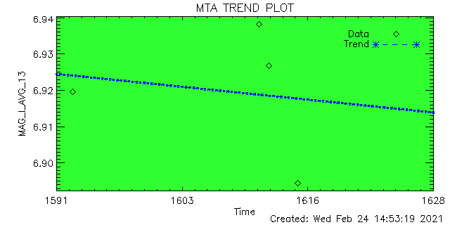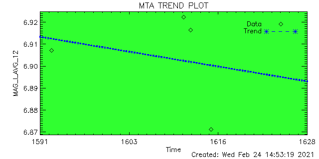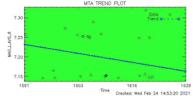 ID | ID String | Magnitude | Data Quality (%) | Total Data | Average | Min | Max | Good | Marginal | Bad | 1 | ACIS-1 | 7.110 | 6.026 | 7.425 | 100 | 0 | 0 | 23 | 2 | ACIS-2 | 7.012 | 6.071 | 7.463 | 100 | 0 | 0 | 38 | 3 | ACIS-3 | 0.000 | 0.000 | 0.000 | 0 | 0 | 0 | 0 | 4 | ACIS-4 | 7.106 | 6.123 | 7.153 | 100 | 0 | 0 | 36 | 5 | ACIS-5 | 7.122 | 6.055 | 7.439 | 100 | 0 | 0 | 51 | 6 | ACIS-6 | 7.204 | 6.922 | 7.331 | 100 | 0 | 0 | 29 | 7 | HRC-I-1 | 6.843 | 6.671 | 6.893 | 100 | 0 | 0 | 3 | 8 | HRC-I-2 | 6.933 | 6.853 | 7.007 | 100 | 0 | 0 | 4 | 9 | HRC-I-3 | 6.982 | 6.886 | 7.009 | 75 | 0 | 25 | 4 | 10 | HRC-I-4 | 6.901 | 6.875 | 6.917 | 100 | 0 | 0 | 1 | 11 | HRC-S-1 | 6.887 | 5.879 | 7.233 | 100 | 0 | 0 | 4 | 12 | HRC-S-2 | 6.904 | 6.693 | 7.285 | 100 | 0 | 0 | 4 | 13 | HRC-S-3 | 6.920 | 6.772 | 7.374 | 100 | 0 | 0 | 4 | 14 | HRC-S-4 | 0.000 | 0.000 | 0.000 | 0 | 0 | 0 | 0 |