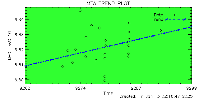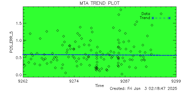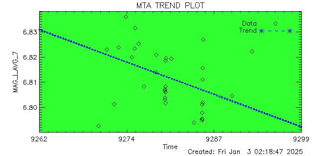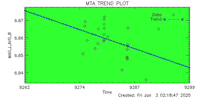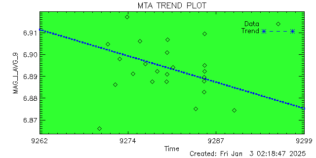 ID | ID String | Magnitude | Data Quality (%) | Total Data | Average | Min | Max | Good | Marginal | Bad | 1 | ACIS-1 | 7.240 | 6.676 | 7.368 | 100 | 0 | 0 | 38 | 2 | ACIS-2 | 7.126 | 6.215 | 7.293 | 100 | 0 | 0 | 66 | 3 | ACIS-3 | 7.418 | 7.015 | 7.542 | 100 | 0 | 0 | 17 | 4 | ACIS-4 | 7.229 | 6.476 | 7.375 | 100 | 0 | 0 | 71 | 5 | ACIS-5 | 7.233 | 6.636 | 7.383 | 100 | 0 | 0 | 91 | 6 | ACIS-6 | 7.305 | 7.014 | 7.502 | 100 | 0 | 0 | 38 | 7 | HRC-I-1 | 6.811 | 6.686 | 6.861 | 100 | 0 | 0 | 34 | 8 | HRC-I-2 | 6.858 | 6.754 | 6.890 | 100 | 0 | 0 | 27 | 9 | HRC-I-3 | 6.893 | 6.650 | 6.938 | 100 | 0 | 0 | 23 | 10 | HRC-I-4 | 6.822 | 6.506 | 6.869 | 100 | 0 | 0 | 24 | 11 | HRC-S-1 | 6.855 | 6.799 | 6.891 | 100 | 0 | 0 | 3 | 12 | HRC-S-2 | 6.850 | 6.262 | 6.893 | 100 | 0 | 0 | 3 | 13 | HRC-S-3 | 6.894 | 6.821 | 6.925 | 100 | 0 | 0 | 3 | 14 | HRC-S-4 | 0.000 | 0.000 | 0.000 | 0 | 0 | 0 | 0 |