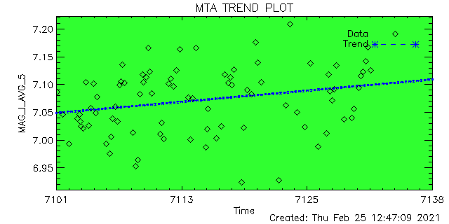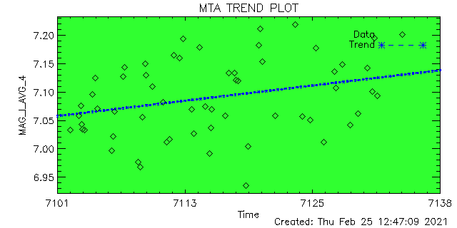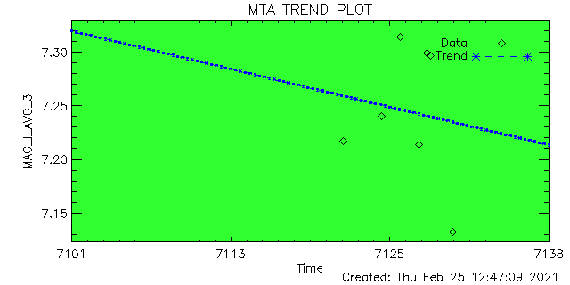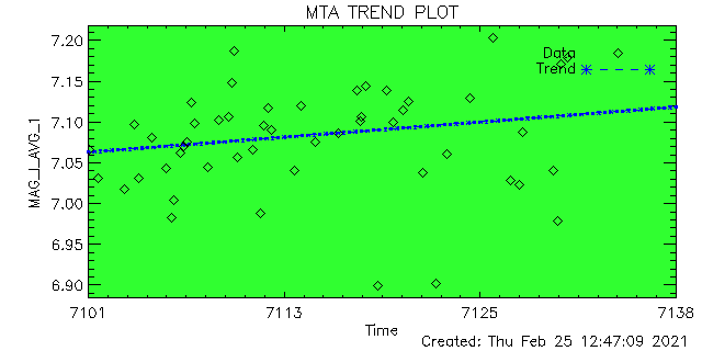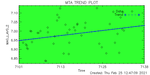 ID | ID String | Magnitude | Data Quality (%) | Total Data | Average | Min | Max | Good | Marginal | Bad | 1 | ACIS-1 | 7.076 | 6.379 | 7.408 | 100 | 0 | 0 | 50 | 2 | ACIS-2 | 6.985 | 5.825 | 7.300 | 100 | 0 | 0 | 47 | 3 | ACIS-3 | 7.245 | 6.721 | 7.405 | 87 | 0 | 12 | 8 | 4 | ACIS-4 | 7.087 | 5.472 | 7.439 | 100 | 0 | 0 | 58 | 5 | ACIS-5 | 7.070 | 5.996 | 7.428 | 100 | 0 | 0 | 85 | 6 | ACIS-6 | 7.113 | 6.223 | 7.417 | 100 | 0 | 0 | 37 | 7 | HRC-I-1 | 6.918 | 6.843 | 6.957 | 100 | 0 | 0 | 2 | 8 | HRC-I-2 | 6.928 | 6.760 | 6.945 | 100 | 0 | 0 | 2 | 9 | HRC-I-3 | 7.005 | 6.908 | 7.029 | 100 | 0 | 0 | 2 | 10 | HRC-I-4 | 0.000 | 0.000 | 0.000 | 0 | 0 | 0 | 0 | 11 | HRC-S-1 | 0.000 | 0.000 | 0.000 | 0 | 0 | 0 | 0 | 12 | HRC-S-2 | 0.000 | 0.000 | 0.000 | 0 | 0 | 0 | 0 | 13 | HRC-S-3 | 0.000 | 0.000 | 0.000 | 0 | 0 | 0 | 0 | 14 | HRC-S-4 | 0.000 | 0.000 | 0.000 | 0 | 0 | 0 | 0 |