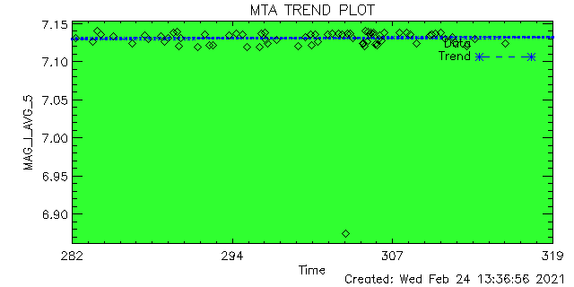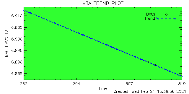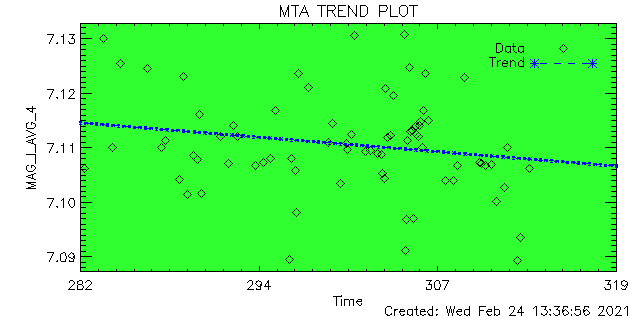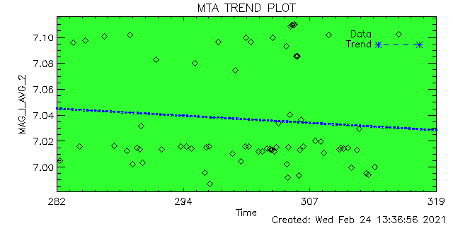 ID | ID String | Magnitude | Data Quality (%) | Total Data | Average | Min | Max | Good | Marginal | Bad | 1 | ACIS-1 | 7.099 | 7.018 | 7.116 | 100 | 0 | 0 | 3 | 2 | ACIS-2 | 7.037 | 6.005 | 7.509 | 98 | 0 | 1 | 73 | 3 | ACIS-3 | 7.317 | 7.269 | 7.333 | 100 | 0 | 0 | 2 | 4 | ACIS-4 | 7.110 | 6.478 | 7.479 | 100 | 0 | 0 | 76 | 5 | ACIS-5 | 7.128 | 5.807 | 7.349 | 100 | 0 | 0 | 73 | 6 | ACIS-6 | 7.180 | 6.889 | 7.336 | 100 | 0 | 0 | 7 | 7 | HRC-I-1 | 6.845 | 6.794 | 6.881 | 100 | 0 | 0 | 8 | 8 | HRC-I-2 | 0.000 | 0.000 | 0.000 | 0 | 0 | 0 | 0 | 9 | HRC-I-3 | 6.943 | 6.850 | 6.971 | 100 | 0 | 0 | 8 | 10 | HRC-I-4 | 6.883 | 6.809 | 6.908 | 100 | 0 | 0 | 8 | 11 | HRC-S-1 | 6.854 | 6.637 | 6.877 | 100 | 0 | 0 | 2 | 12 | HRC-S-2 | 0.000 | 0.000 | 0.000 | 0 | 0 | 0 | 0 | 13 | HRC-S-3 | 6.889 | 6.756 | 6.902 | 100 | 0 | 0 | 2 | 14 | HRC-S-4 | 6.863 | 6.199 | 6.915 | 100 | 0 | 0 | 2 |