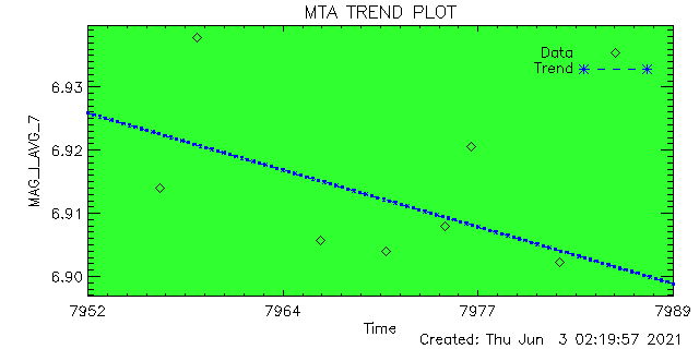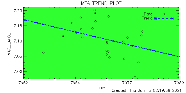 ID | ID String | Magnitude | Data Quality (%) | Total Data | Average | Min | Max | Good | Marginal | Bad | 1 | ACIS-1 | 7.108 | 6.856 | 7.826 | 100 | 0 | 0 | 27 | 2 | ACIS-2 | 6.958 | 4.742 | 7.248 | 100 | 0 | 0 | 60 | 3 | ACIS-3 | 7.231 | 6.251 | 7.428 | 100 | 0 | 0 | 14 | 4 | ACIS-4 | 7.079 | 5.900 | 7.426 | 100 | 0 | 0 | 61 | 5 | ACIS-5 | 7.066 | 6.071 | 7.495 | 100 | 0 | 0 | 87 | 6 | ACIS-6 | 7.110 | 6.623 | 7.417 | 100 | 0 | 0 | 36 | 7 | HRC-I-1 | 6.913 | 6.776 | 6.978 | 100 | 0 | 0 | 7 | 8 | HRC-I-2 | 6.942 | 6.851 | 7.024 | 100 | 0 | 0 | 6 | 9 | HRC-I-3 | 7.019 | 6.591 | 7.077 | 100 | 0 | 0 | 7 | 10 | HRC-I-4 | 6.943 | 6.627 | 6.983 | 100 | 0 | 0 | 4 | 11 | HRC-S-1 | 6.972 | 6.484 | 7.056 | 100 | 0 | 0 | 7 | 12 | HRC-S-2 | 6.933 | 6.785 | 7.041 | 100 | 0 | 0 | 5 | 13 | HRC-S-3 | 6.948 | 6.703 | 7.234 | 100 | 0 | 0 | 7 | 14 | HRC-S-4 | 6.955 | 6.589 | 7.003 | 100 | 0 | 0 | 2 |