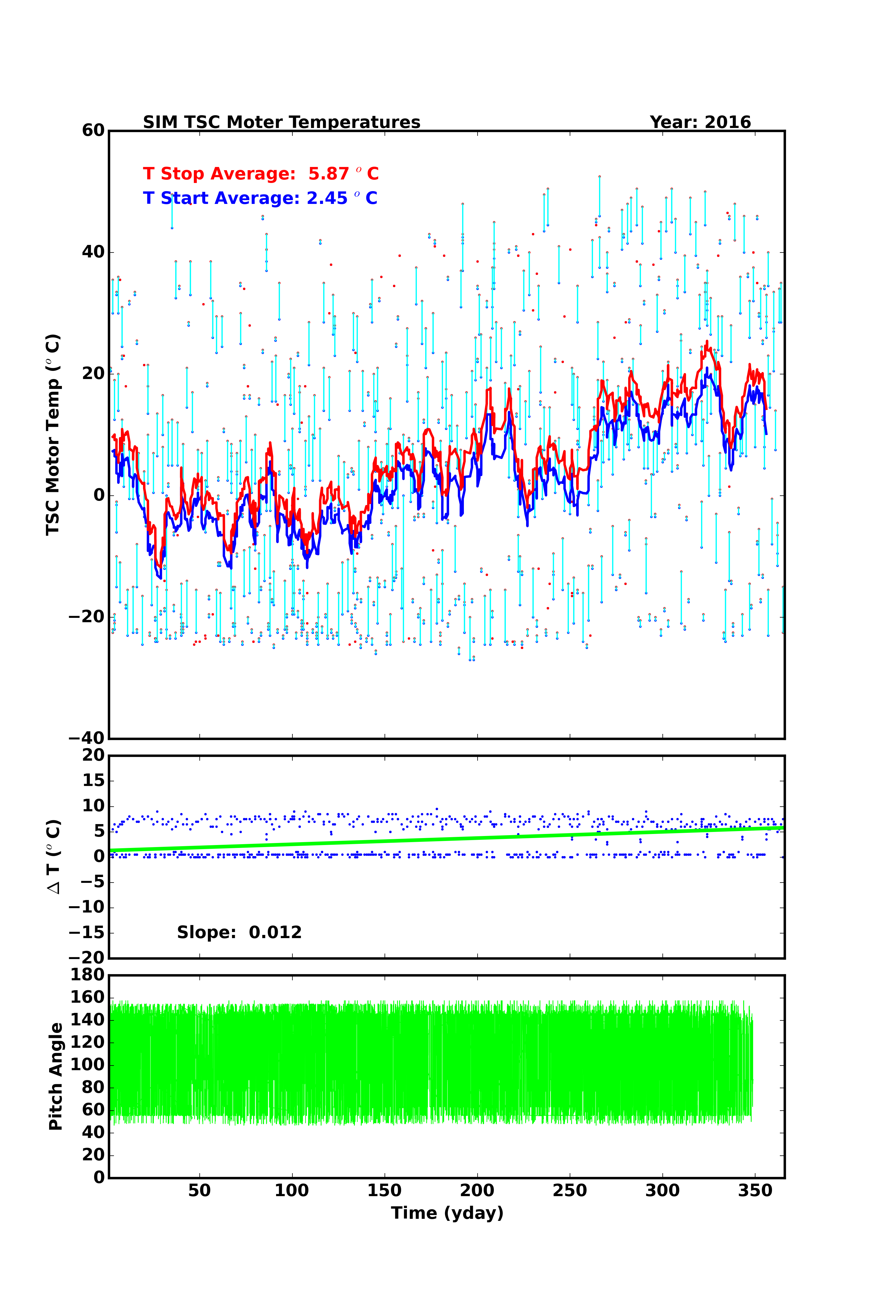 The second plot is the time trend of ΔT, and the third plot is the time trend of spacecraft pitch angle (pt_suncent_ang) for reference. We also plot the relationship between ΔT vs. move distance.