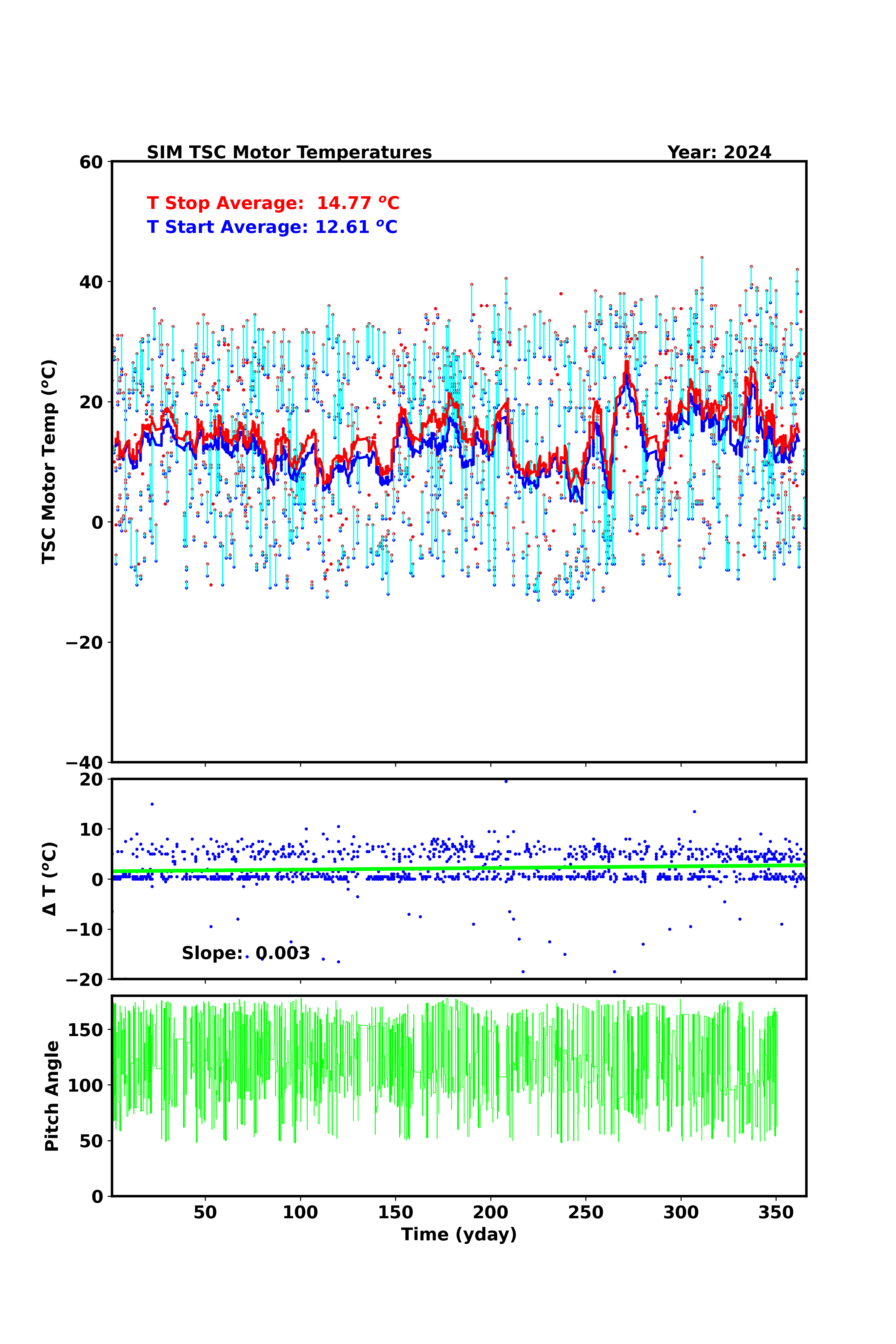 The second plot is the time trend of ΔT, and the third plot is the time trend of spacecraft pitch angle (pt_suncent_ang) for reference. We also plot the relationship between ΔT vs. move distance.