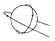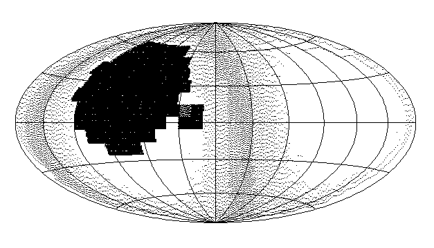 Figure 2. Same as Fig. 1, but for two of the 98-minute orbits of AXAF-S about two months after launch. The large dark forbidden region near (5h,+20deg) is caused by the presence of the Sun, while the Moon appears near (1h,0deg), and the orbital plane (which is partially obscured by the Earth) can be seen as a grey great circle. The restriction to a `normal observing zone' within +/-20deg of the orbital plane has not been taken into account in this diagram since observations outside this region are permitted.