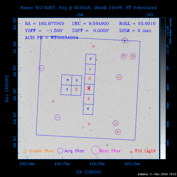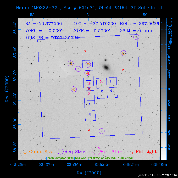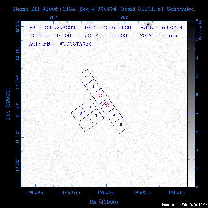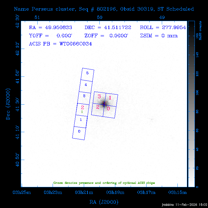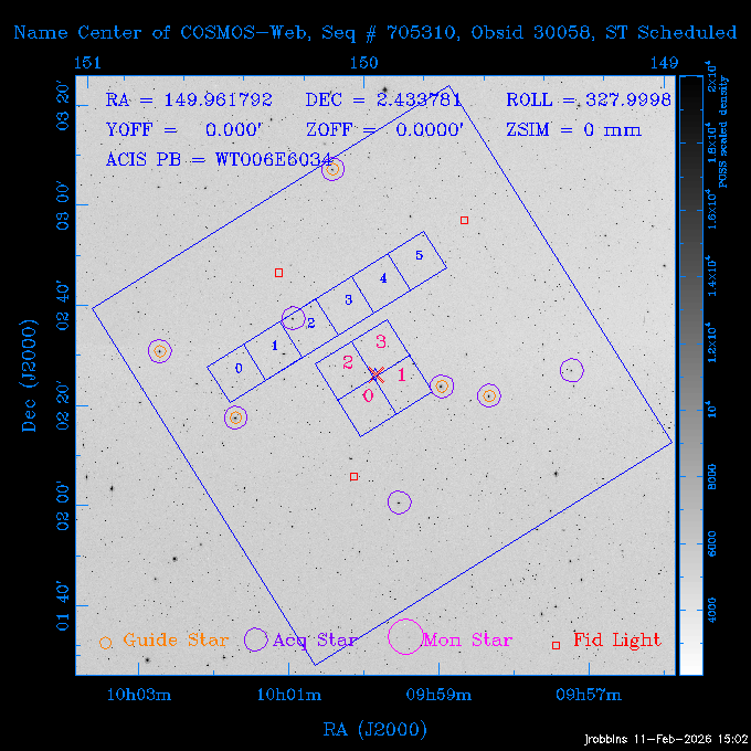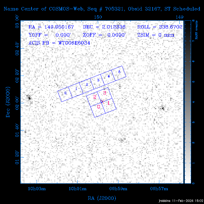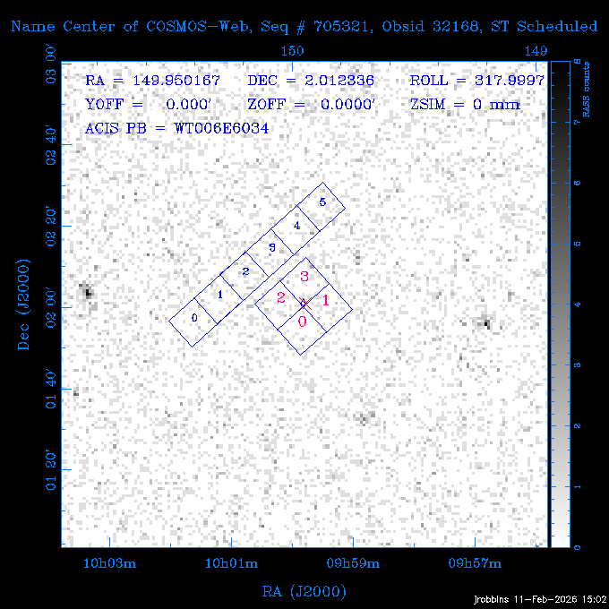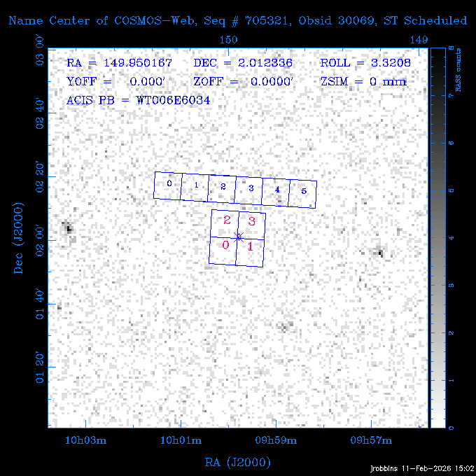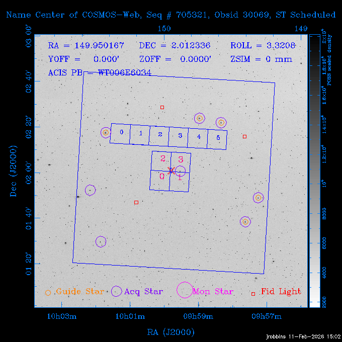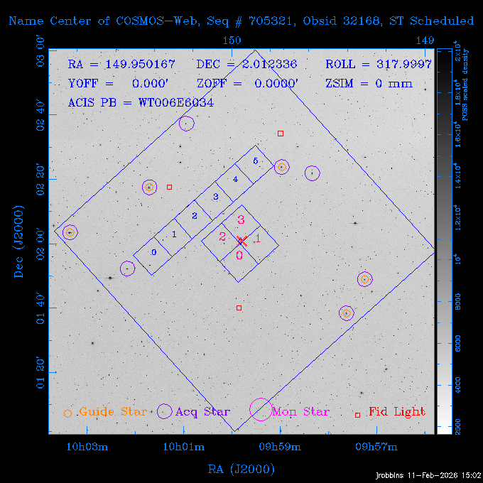 Seq # NB ObsID Constr. Target Start Time SI Grat Active Chips RA Dec Roll Pitch Slew Overlays ------ --- ----- ------- -------------------- --------------------- ----- ------ ---- ----------------- -------- -------- ------ ------ ------ ------------- 705466 P1 31431 0 PGC101434 2026:037:14:01:59.129 11.0 ACIS-S NONE S2,S3,S4 8.0775 15.0039 300.75 56.60 117.64 dss pspc rass 802203 32145 0 ZwCl 0857.9+2107 2026:037:17:46:55.469 10.0 ACIS-S NONE S1,S2,S3 135.1535 20.8945 221.87 172.94 117.48 dss pspc rass 705466 P1 32149 0 PGC101434 2026:037:21:15:11.921 11.0 ACIS-S NONE S2,S3,S4 8.0775 15.0039 300.84 56.30 117.48 dss pspc rass 802203 30399 0 ZwCl 0857.9+2107 2026:038:01:00:00.593 11.0 ACIS-S NONE S1,S2,S3 135.1535 20.8945 233.00 172.68 116.90 dss pspc rass 705305 32143 0 [vD2023]1 2026:038:04:41:37.288 18.0 ACIS-I NONE I0,I1,I2,I3 40.4405 -8.3506 284.16 78.13 102.50 dss pspc rass 802203 32146 0 ZwCl 0857.9+2107 2026:038:10:19:50.427 14.0 ACIS-S NONE S1,S2,S3 135.1535 20.8945 234.00 172.33 102.24 dss pspc rass 201908 CCT 32140 0 G 132-50 2026:038:14:50:13.255 4.8 ACIS-S NONE S2,S3 15.9179 40.8574 305.46 75.77 96.96 dss pspc rass 901886 30494 0 CMZ Molecular Cloud 2026:038:16:59:39.566 11.6 ACIS-I NONE I0,I1,I2,I3 266.5505 -28.8887 87.21 51.80 152.72 dss pspc rass 802268 CCT 32139 0 RMJ093723.8+125312.3 2026:038:20:56:06.721 11.0 ACIS-I NONE I0,I1,I2,I3 144.3494 12.8868 52.11 176.12 124.29 dss pspc rass 402609 TOO 31079 3 GS 1354-64 2026:039:00:36:06.074 30.0 ACIS-S HETG S0,S1,S2,S3,S4,S5 209.5405 -64.7348 61.99 85.17 95.20 dss pspc rass 705269 32141 0 BOSS1348 2026:039:09:31:54.177 7.6 ACIS-I NONE I0,I1,I2,I3 207.0600 23.9800 85.18 118.24 91.36 dss pspc rass ---- 41744 CAL-ER (PER07) 2026:039:12:08:42.683 2.0 -- -- 146.1000 14.3000 79.61 175.78 63.66 ---- 41743 CAL-ER (PER08) 2026:039:14:00:00.000 2.0 -- -- 136.0000 20.0000 229.12 172.49 146.69 ---- 41742 CAL-ER (CAL01) 2026:039:15:45:00.000 3.0 -- -- 354.2000 22.5000 316.91 49.01 123.52 ---- 41741 CAL-ER (PER04) 2026:039:19:29:47.109 5.5 -- -- 30.0000 43.0000 295.96 84.82 36.01 ---- 41740 CAL-ER (CAL01) 2026:039:22:00:00.000 1.0 -- -- 136.0000 20.0000 230.14 172.19 87.59 ---- 41739 CAL-ER (CAL01) 2026:039:23:15:00.000 1.0 -- -- 149.1622 13.0045 73.58 173.04 153.02 901886 32148 0 CMZ Molecular Cloud 2026:040:00:49:21.263 7.0 ACIS-I NONE I0,I1,I2,I3 266.5505 -28.8887 92.75 53.12 120.26 dss pspc rass 705317 30065 0 Center of COSMOS-Web 2026:040:03:27:08.811 17.8 ACIS-I NONE I0,I1,I2,I3 149.9958 2.1376 29.94 165.26 115.32 dss pspc rass 402579 29797 1 Cir X-1 2026:040:08:58:34.783 26.0 ACIS-S HETG S1,S2,S3,S4 230.1708 -57.1667 71.50 78.97 86.70 dss pspc rass 705317 32154 0 Center of COSMOS-Web 2026:040:16:46:39.624 21.0 ACIS-I NONE I0,I1,I2,I3 149.9958 2.1376 28.37 165.68 86.61 dss pspc rass 402579 32153 1 Cir X-1 2026:040:23:11:24.460 26.0 ACIS-S HETG S1,S2,S3,S4 230.1708 -57.1667 71.50 79.44 86.61 dss pspc rass 705465 P1 31430 0 PGC031877 2026:041:07:02:03.131 20.0 ACIS-S NONE S2,S3,S4 160.5015 12.3349 80.57 163.41 98.15 dss pspc rass ---- 41738 CAL-ER (IAT01) 2026:041:12:57:00.859 0.0 -- -- 202.6191 25.8899 89.70 124.07 47.76 503641 TOO 31163 2 GRB 221009A 2026:041:13:30:09.892 15.0 ACIS-S NONE I3,S2,S3,S4 288.2646 19.7734 46.00 48.91 77.85 dss pspc rass ---- 41737 CAL-ER (IAT02) 2026:041:18:04:35.439 0.0 -- -- 246.4208 -13.6333 78.57 74.92 60.42 503596 30850 1 G292.0+1.8 2026:041:18:36:10.730 30.7 ACIS-I NONE I0,I1,I2,I3 171.1485 -59.2657 26.92 103.19 70.82 dss pspc rass ---- 41736 CAL-ER (PER01) 2026:042:03:38:35.531 3.0 -- -- 147.5944 8.6723 29.17 173.69 71.82 ---- 41735 CAL-ER (PER04) 2026:042:08:13:30.000 3.0 -- -- 280.5514 -46.7293 116.80 49.07 124.97 ---- 41734 CAL-ER (PER06) 2026:042:09:38:57.848 0.9 -- -- 13.5770 -38.6554 254.10 49.49 89.84 ---- 41733 CAL-ER (PER05) 2026:042:10:26:35.403 3.0 -- -- 101.1745 -23.1614 306.83 123.45 73.99 ---- 41732 CAL-ER (PER07) 2026:042:12:55:00.000 0.9 -- -- 140.2847 12.1099 294.21 175.20 54.49 ---- 41731 CAL-ER (CAL01) 2026:042:13:53:23.862 0.9 -- -- 19.6933 -29.3676 265.49 52.73 122.46 ---- 41730 CAL-ER (PER08) 2026:042:14:50:41.816 2.0 -- -- 134.2000 12.1000 281.64 169.42 117.52 802196 30295 0 Perseus cluster 2026:042:16:09:25.354 55.0 ACIS-I NONE I0,I1,I2,I3,S2 49.9508 41.5117 283.80 95.57 87.42 dss pspc rass 705530 CCT 32152 0 Mrk704 2026:043:07:59:26.842 10.0 ACIS-S NONE S2,S3 139.6083 16.3055 247.30 173.68 80.36 dss pspc rass 802196 30298 0 Perseus cluster 2026:043:11:19:27.556 36.5 ACIS-I NONE I0,I1,I2,I3 49.9508 41.5117 284.14 94.82 80.30 dss pspc rass 705528 CCT 32150 0 SDSSJ093034.43+20441 2026:043:22:01:12.308 10.0 ACIS-S NONE S2,S3 142.6435 20.7380 205.81 172.11 80.61 dss pspc rass 802196 30302 0 Perseus cluster 2026:044:01:21:17.699 30.0 ACIS-I NONE I0,I1,I2,I3,S2 49.9508 41.5117 284.36 94.27 80.65 dss pspc rass 705529 CCT 32151 0 SDSSJ092313.77+15022 2026:044:10:15:19.584 15.0 ACIS-S NONE S2,S3 140.8074 15.0394 254.75 174.08 83.39 dss pspc rass 503542 29827 2 SN 1986J 2026:044:15:01:37.768 14.4 ACIS-S NONE I2,I3,S2,S3 35.6305 42.3323 294.25 83.97 93.61 dss pspc rass ---- 41729 CAL-ER (PER09) 2026:044:19:37:13.711 3.0 -- -- 140.7401 16.1830 245.39 173.25 91.21 ---- 41728 CAL-ER (PER11) 2026:044:21:00:12.538 3.0 -- -- 143.0104 7.9602 323.19 173.35 78.66 ---- 41727 CAL-ER (CAL01) 2026:044:22:33:35.663 0.9 -- -- 13.5770 -38.6554 251.17 48.16 125.48 ---- 41726 CAL-ER (PER10) 2026:045:02:00:00.000 3.0 -- -- 107.9000 -33.2000 314.30 120.32 72.99 ---- 41725 CAL-ER (CAL01) 2026:045:04:30:00.000 0.9 -- -- 143.0104 7.9602 320.70 173.25 53.02 ---- 41724 CAL-ER (CAL01) 2026:045:05:28:34.206 0.9 -- -- 20.3207 -28.5671 264.03 51.33 123.24 ---- 41723 CAL-ER (PER12) 2026:045:06:17:38.514 0.9 -- -- 303.5728 -58.0255 148.14 48.37 80.50 705307 30238 0 Center of COSMOS-Web 2026:045:07:27:21.984 18.0 ACIS-I NONE I0,I1,I2,I3 150.3376 2.2971 14.19 168.81 120.42 dss pspc rass ---- 41722 CAL-ER (IAT03) 2026:045:12:55:28.197 0.0 -- -- 204.1710 -4.0812 72.00 121.43 76.97 503641 TOO 32158 2 GRB 221009A 2026:045:1
