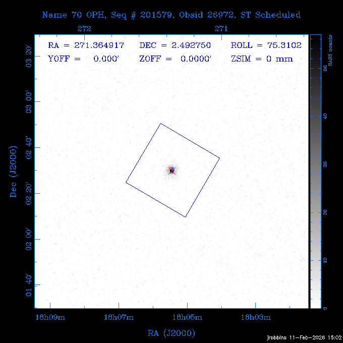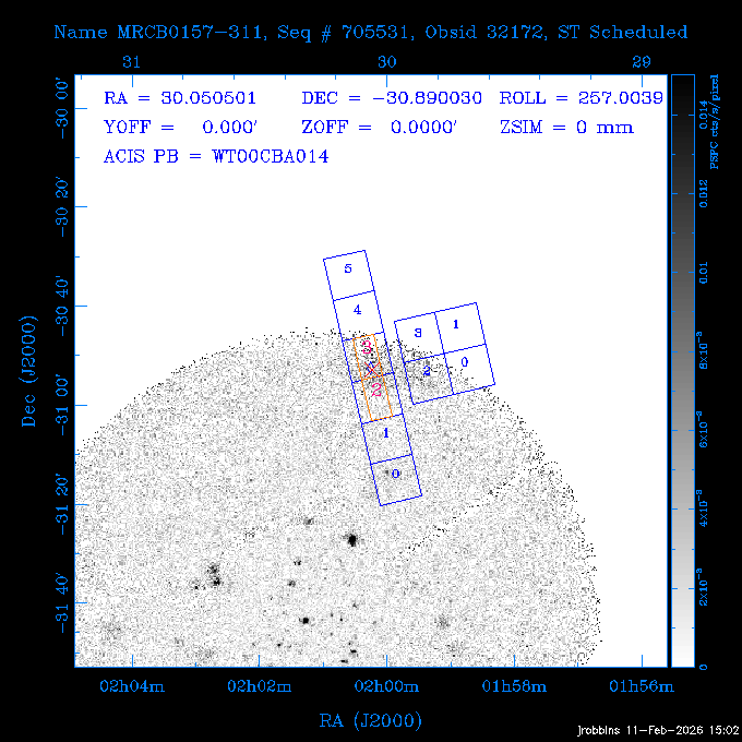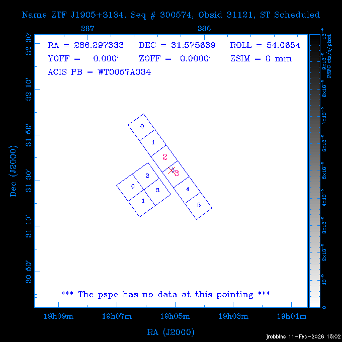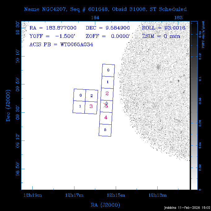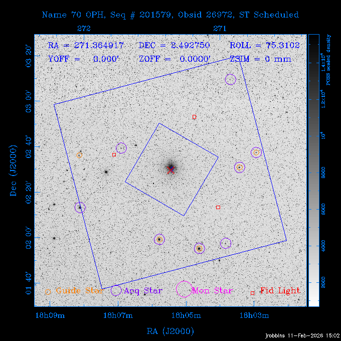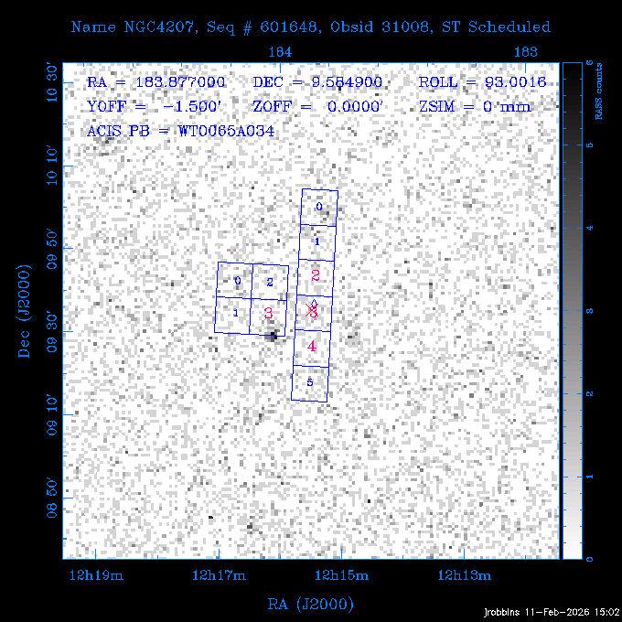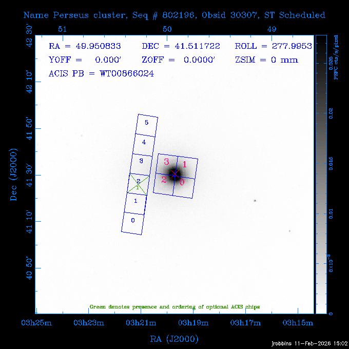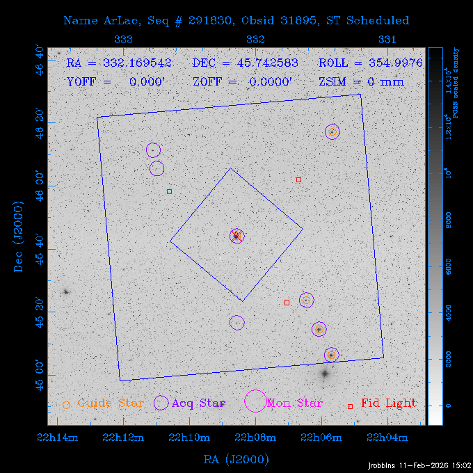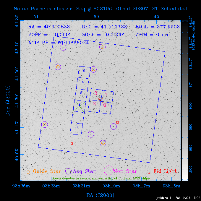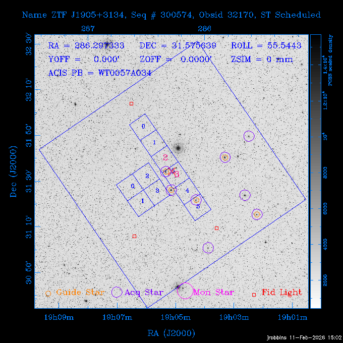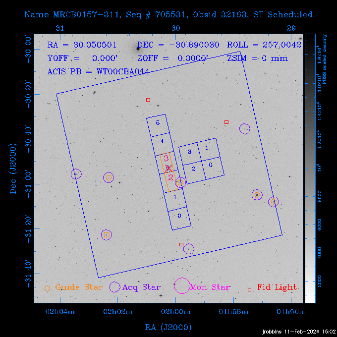 Seq # NB ObsID Constr. Target Start Time SI Grat Active Chips RA Dec Roll Pitch Slew Overlays ------ --- ----- ------- -------------------- --------------------- ----- ------ ---- ----------------- -------- -------- ------ ------ ------ ------------- 705466 P1 31431 0 PGC101434 2026:037:14:01:59.129 11.0 ACIS-S NONE S2,S3,S4 8.0775 15.0039 300.75 56.60 117.64 dss pspc rass 802203 32145 0 ZwCl 0857.9+2107 2026:037:17:46:55.469 10.0 ACIS-S NONE S1,S2,S3 135.1535 20.8945 221.87 172.94 117.48 dss pspc rass 705466 P1 32149 0 PGC101434 2026:037:21:15:11.921 11.0 ACIS-S NONE S2,S3,S4 8.0775 15.0039 300.84 56.30 117.48 dss pspc rass 802203 30399 0 ZwCl 0857.9+2107 2026:038:01:00:00.593 11.0 ACIS-S NONE S1,S2,S3 135.1535 20.8945 233.00 172.68 116.90 dss pspc rass 705305 32143 0 [vD2023]1 2026:038:04:41:37.288 18.0 ACIS-I NONE I0,I1,I2,I3 40.4405 -8.3506 284.16 78.13 102.50 dss pspc rass 802203 32146 0 ZwCl 0857.9+2107 2026:038:10:19:50.427 14.0 ACIS-S NONE S1,S2,S3 135.1535 20.8945 234.00 172.33 102.24 dss pspc rass 201908 CCT 32140 0 G 132-50 2026:038:14:50:13.255 4.8 ACIS-S NONE S2,S3 15.9179 40.8574 305.46 75.77 96.96 dss pspc rass 901886 30494 0 CMZ Molecular Cloud 2026:038:16:59:39.566 11.6 ACIS-I NONE I0,I1,I2,I3 266.5505 -28.8887 87.21 51.80 152.72 dss pspc rass 802268 CCT 32139 0 RMJ093723.8+125312.3 2026:038:20:56:06.721 11.0 ACIS-I NONE I0,I1,I2,I3 144.3494 12.8868 52.11 176.12 124.29 dss pspc rass 402609 TOO 31079 3 GS 1354-64 2026:039:00:36:06.074 30.0 ACIS-S HETG S0,S1,S2,S3,S4,S5 209.5405 -64.7348 61.99 85.17 95.20 dss pspc rass 705269 32141 0 BOSS1348 2026:039:09:31:54.177 7.6 ACIS-I NONE I0,I1,I2,I3 207.0600 23.9800 85.18 118.24 91.36 dss pspc rass ---- 41744 CAL-ER (PER07) 2026:039:12:08:42.683 2.0 -- -- 146.1000 14.3000 79.61 175.78 63.66 ---- 41743 CAL-ER (PER08) 2026:039:14:00:00.000 2.0 -- -- 136.0000 20.0000 229.12 172.49 146.69 ---- 41742 CAL-ER (CAL01) 2026:039:15:45:00.000 3.0 -- -- 354.2000 22.5000 316.91 49.01 123.52 ---- 41741 CAL-ER (PER04) 2026:039:19:29:47.109 5.5 -- -- 30.0000 43.0000 295.96 84.82 36.01 ---- 41740 CAL-ER (CAL01) 2026:039:22:00:00.000 1.0 -- -- 136.0000 20.0000 230.14 172.19 87.59 ---- 41739 CAL-ER (CAL01) 2026:039:23:15:00.000 1.0 -- -- 149.1622 13.0045 73.58 173.04 153.02 901886 32148 0 CMZ Molecular Cloud 2026:040:00:49:21.263 7.0 ACIS-I NONE I0,I1,I2,I3 266.5505 -28.8887 92.75 53.12 120.26 dss pspc rass 705317 30065 0 Center of COSMOS-Web 2026:040:03:27:08.811 17.8 ACIS-I NONE I0,I1,I2,I3 149.9958 2.1376 29.94 165.26 115.32 dss pspc rass 402579 29797 1 Cir X-1 2026:040:08:58:34.783 26.0 ACIS-S HETG S1,S2,S3,S4 230.1708 -57.1667 71.50 78.97 86.70 dss pspc rass 705317 32154 0 Center of COSMOS-Web 2026:040:16:46:39.624 21.0 ACIS-I NONE I0,I1,I2,I3 149.9958 2.1376 28.37 165.68 86.61 dss pspc rass 402579 32153 1 Cir X-1 2026:040:23:11:24.460 26.0 ACIS-S HETG S1,S2,S3,S4 230.1708 -57.1667 71.50 79.44 86.61 dss pspc rass 705465 P1 31430 0 PGC031877 2026:041:07:02:03.131 20.0 ACIS-S NONE S2,S3,S4 160.5015 12.3349 80.57 163.41 98.15 dss pspc rass ---- 41738 CAL-ER (IAT01) 2026:041:12:57:00.859 0.0 -- -- 202.6191 25.8899 89.70 124.07 47.76 503641 TOO 31163 2 GRB 221009A 2026:041:13:30:09.892 15.0 ACIS-S NONE I3,S2,S3,S4 288.2646 19.7734 46.00 48.91 77.85 dss pspc rass ---- 41737 CAL-ER (IAT02) 2026:041:18:04:35.439 0.0 -- -- 246.4208 -13.6333 78.57 74.92 60.42 503596 30850 1 G292.0+1.8 2026:041:18:36:10.730 30.7 ACIS-I NONE I0,I1,I2,I3 171.1485 -59.2657 26.92 103.19 70.82 dss pspc rass ---- 41736 CAL-ER (PER01) 2026:042:03:38:35.531 3.0 -- -- 147.5944 8.6723 29.17 173.69 71.82 ---- 41735 CAL-ER (PER04) 2026:042:08:13:30.000 3.0 -- -- 280.5514 -46.7293 116.80 49.07 124.97 ---- 41734 CAL-ER (PER06) 2026:042:09:38:57.848 0.9 -- -- 13.5770 -38.6554 254.10 49.49 89.84 ---- 41733 CAL-ER (PER05) 2026:042:10:26:35.403 3.0 -- -- 101.1745 -23.1614 306.83 123.45 73.99 ---- 41732 CAL-ER (PER07) 2026:042:12:55:00.000 0.9 -- -- 140.2847 12.1099 294.21 175.20 54.49 ---- 41731 CAL-ER (CAL01) 2026:042:13:53:23.862 0.9 -- -- 19.6933 -29.3676 265.49 52.73 122.46 ---- 41730 CAL-ER (PER08) 2026:042:14:50:41.816 2.0 -- -- 134.2000 12.1000 281.64 169.42 117.52 802196 30295 0 Perseus cluster 2026:042:16:09:25.354 55.0 ACIS-I NONE I0,I1,I2,I3,S2 49.9508 41.5117 283.80 95.57 87.42 dss pspc rass 705530 CCT 32152 0 Mrk704 2026:043:07:59:26.842 10.0 ACIS-S NONE S2,S3 139.6083 16.3055 247.30 173.68 80.36 dss pspc rass 802196 30298 0 Perseus cluster 2026:043:11:19:27.556 36.5 ACIS-I NONE I0,I1,I2,I3 49.9508 41.5117 284.14 94.82 80.30 dss pspc rass 705528 CCT 32150 0 SDSSJ093034.43+20441 2026:043:22:01:12.308 10.0 ACIS-S NONE S2,S3 142.6435 20.7380 205.81 172.11 80.61 dss pspc rass 802196 30302 0 Perseus cluster 2026:044:01:21:17.699 30.0 ACIS-I NONE I0,I1,I2,I3,S2 49.9508 41.5117 284.36 94.27 80.65 dss pspc rass 705529 CCT 32151 0 SDSSJ092313.77+15022 2026:044:10:15:19.584 15.0 ACIS-S NONE S2,S3 140.8074 15.0394 254.75 174.08 83.39 dss pspc rass 503542 29827 2 SN 1986J 2026:044:15:01:37.768 14.4 ACIS-S NONE I2,I3,S2,S3 35.6305 42.3323 294.25 83.97 93.61 dss pspc rass ---- 41729 CAL-ER (PER09) 2026:044:19:37:13.711 3.0 -- -- 140.7401 16.1830 245.39 173.25 91.21 ---- 41728 CAL-ER (PER11) 2026:044:21:00:12.538 3.0 -- -- 143.0104 7.9602 323.19 173.35 78.66 ---- 41727 CAL-ER (CAL01) 2026:044:22:33:35.663 0.9 -- -- 13.5770 -38.6554 251.17 48.16 125.48 ---- 41726 CAL-ER (PER10) 2026:045:02:00:00.000 3.0 -- -- 107.9000 -33.2000 314.30 120.32 72.99 ---- 41725 CAL-ER (CAL01) 2026:045:04:30:00.000 0.9 -- -- 143.0104 7.9602 320.70 173.25 53.02 ---- 41724 CAL-ER (CAL01) 2026:045:05:28:34.206 0.9 -- -- 20.3207 -28.5671 264.03 51.33 123.24 ---- 41723 CAL-ER (PER12) 2026:045:06:17:38.514 0.9 -- -- 303.5728 -58.0255 148.14 48.37 80.50 705307 30238 0 Center of COSMOS-Web 2026:045:07:27:21.984 18.0 ACIS-I NONE I0,I1,I2,I3 150.3376 2.2971 14.19 168.81 120.42 dss pspc rass ---- 41722 CAL-ER (IAT03) 2026:045:12:55:28.197 0.0 -- -- 204.1710 -4.0812 72.00 121.43 76.97 503641 TOO 32158 2 GRB 221009A 2026:045:1