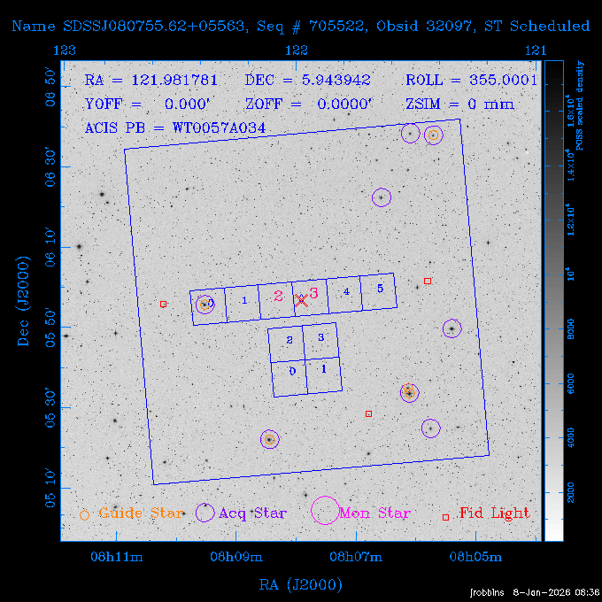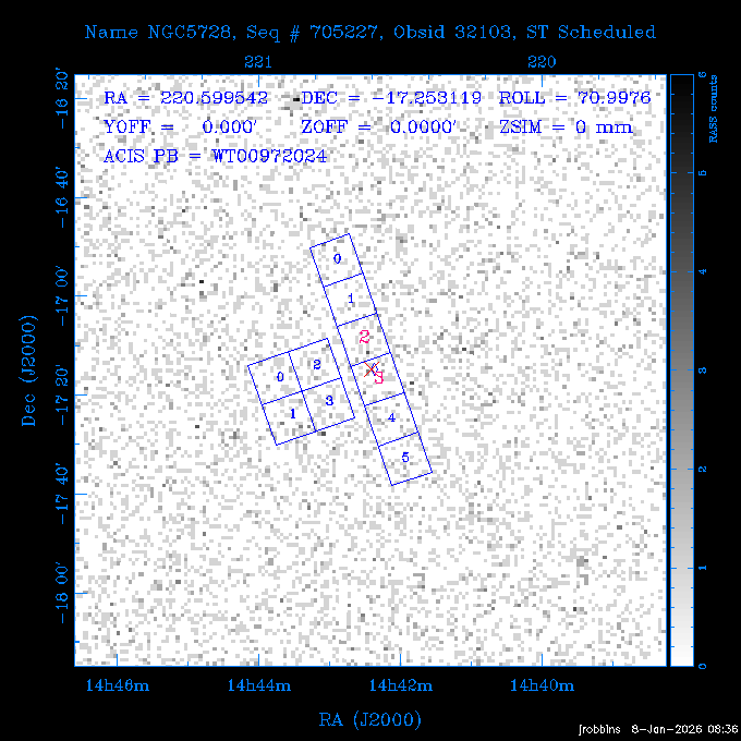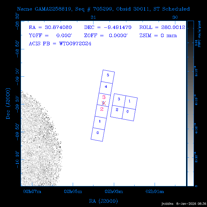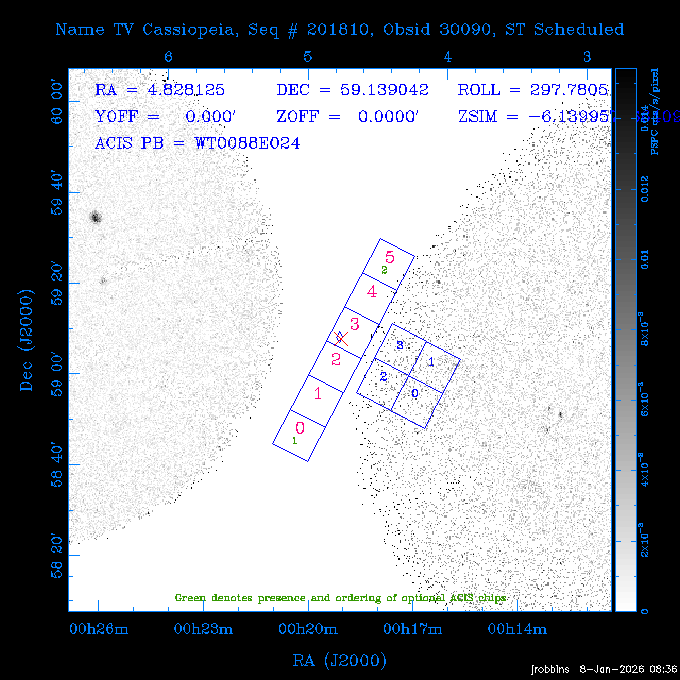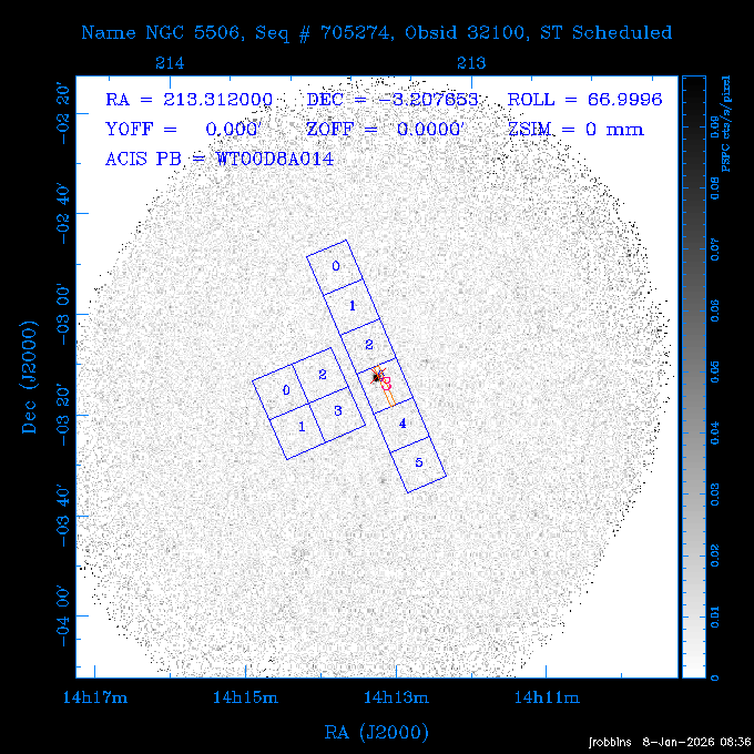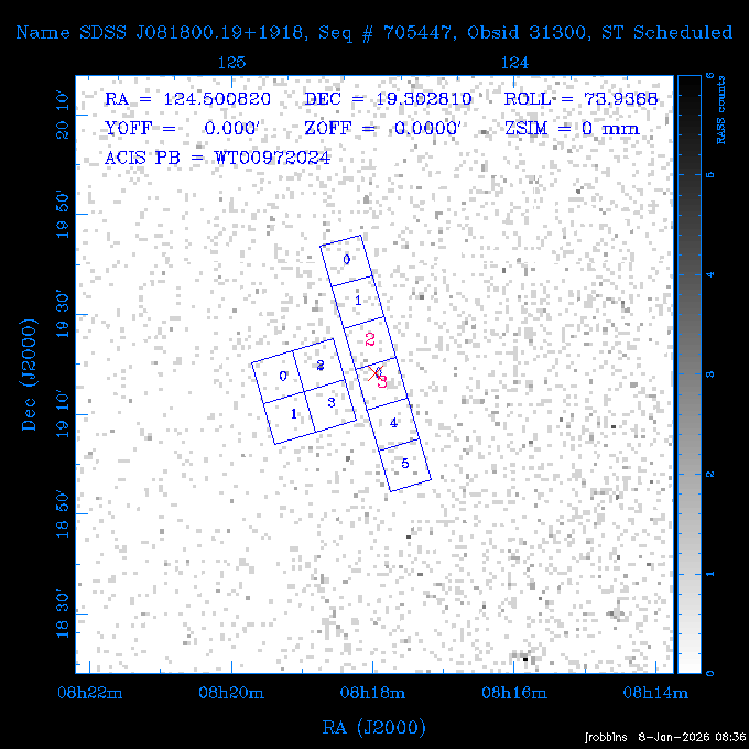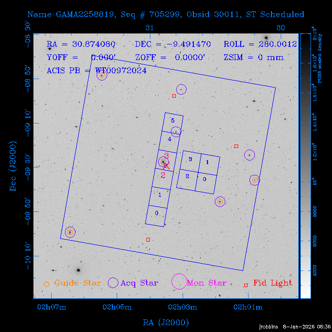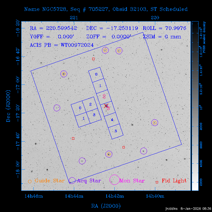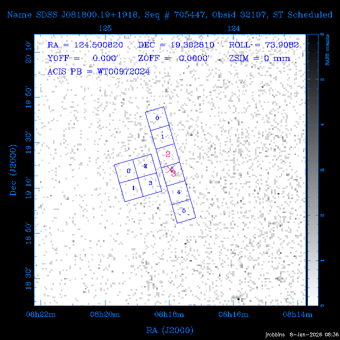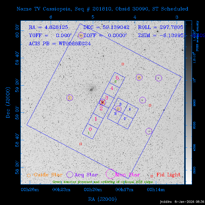 Seq # NB ObsID Constr. Target Start Time SI Grat Active Chips RA Dec Roll Pitch Slew Overlays ------ --- ----- ------- -------------------- --------------------- ----- ------ ---- ----------------- -------- -------- ------ ------ ------ ------------- 802245 31322 0 ACT-CLJ0808.7+1420 2025:363:03:18:51.889 19.5 ACIS-S NONE S2,S3 122.1975 14.3500 65.04 155.41 88.82 dss pspc rass 705288 30000 0 4C +05.57 2025:363:09:17:52.544 14.6 ACIS-S NONE S2,S3,S4 205.6818 5.0756 61.00 76.13 83.30 dss pspc rass 601655 29660 0 NGC4571 2025:363:13:46:29.544 38.0 ACIS-S NONE I3,S2,S3,S4 189.2349 14.2174 58.50 94.84 19.33 dss pspc rass 705444 31297 0 SDSS J074932.95+2834 2025:364:00:50:39.495 14.8 ACIS-S NONE S2,S3 117.3873 28.5685 103.54 162.58 69.00 dss pspc rass 705288 32083 0 4C +05.57 2025:364:05:32:00.113 16.5 ACIS-S NONE S2,S3,S4 205.6818 5.0756 64.74 76.95 86.30 dss pspc rass 705412 31265 0 SDSS J080010.70+3124 2025:364:10:42:00.288 13.0 ACIS-S NONE S2,S3 120.0446 31.4159 109.02 159.92 84.24 dss pspc rass 705288 32084 0 4C +05.57 2025:364:14:52:59.719 17.3 ACIS-S NONE S2,S3,S4 205.6818 5.0756 61.00 77.32 84.71 dss pspc rass ---- 41843 CAL-ER (PER01) 2025:364:20:17:47.068 3.0 -- -- 108.0000 24.0000 94.86 172.45 94.93 ---- 41842 CAL-ER (PER02) 2025:364:21:34:05.651 3.0 -- -- 105.2458 30.1343 144.30 171.52 48.60 ---- 41841 CAL-ER (PER03) 2025:364:23:05:47.322 3.0 -- -- 283.5439 34.1864 356.07 57.42 117.88 ---- 41840 CAL-ER (PER04) 2025:365:00:30:20.222 3.0 -- -- 97.4121 59.9601 183.98 143.11 85.72 ---- 41839 CAL-ER (PER05) 2025:365:03:20:00.000 3.0 -- -- 105.0000 28.0000 137.13 173.43 52.09 ---- 41838 CAL-ER (PER06) 2025:365:04:50:45.843 3.0 -- -- 250.2808 29.6778 31.97 60.12 113.69 802207 30426 0 Abell 2255 2025:365:07:13:24.904 12.0 ACIS-I NONE I0,I1,I2,I3 258.2085 64.0529 16.02 88.85 36.07 dss pspc rass 802196 30291 0 Perseus cluster 2025:365:11:06:15.118 15.7 ACIS-I NONE I0,I1,I2,I3 49.9508 41.5117 262.52 134.22 78.02 dss pspc rass 802207 32088 0 Abell 2255 2025:365:16:00:40.645 19.4 ACIS-I NONE I0,I1,I2,I3 258.2085 64.0529 17.02 88.91 77.66 dss pspc rass 705434 P1 31287 0 UGC 04040 2025:365:21:57:35.620 10.0 ACIS-S NONE S2,S3 117.4621 33.9623 119.99 161.96 81.37 dss pspc rass ---- 41837 CAL-ER (IAT01) 2026:001:01:15:51.828 0.0 -- -- 179.0000 -23.0000 64.09 91.45 92.72 503632 31587 0 sn1006 NE 2026:001:01:41:20.234 12.5 ACIS-I NONE I0,I1,I2,I3 225.9370 -41.7851 90.61 49.28 43.21 dss pspc rass ---- 41836 CAL-ER (IAT02) 2026:001:05:35:42.118 0.0 -- -- 103.0000 -66.0000 1.50 90.92 67.64 802204 30403 0 ClG J0242-2132 2026:001:06:05:35.286 30.0 ACIS-S NONE I3,S1,S2,S3 40.6496 -21.5406 289.99 105.92 63.16 dss pspc rass 705520 CCT 32076 0 B2.4 0628+21B 2026:001:14:56:54.725 17.6 ACIS-S NONE S2,S3,S4 97.8768 21.8520 299.01 176.18 71.21 dss pspc rass 705287 29999 2 2MASX J01110461-4558 2026:001:20:28:00.005 22.0 ACIS-S NONE I3,S2,S3,S4 17.7693 -45.9788 292.48 77.44 100.15 dss pspc rass 790396 31732 3 MKN421 2026:002:03:26:50.914 27.7 ACIS-S LETG S1,S2,S3 166.1133 38.2088 73.00 124.16 165.07 dss pspc rass ---- 41835 CAL-ER (PER29) 2026:002:11:26:44.747 0.9 -- -- 178.0820 37.0300 79.14 114.87 16.49 ---- 41834 CAL-ER (PER07) 2026:002:12:11:50.252 3.0 -- -- 108.0000 24.0000 101.47 175.07 62.59 ---- 41833 CAL-ER (PER08) 2026:002:13:41:53.335 1.0 -- -- 102.4473 20.0103 353.20 177.07 110.48 ---- 41832 CAL-ER (PER09) 2026:002:14:39:04.747 1.0 -- -- 5.8612 -53.8990 278.62 67.62 112.61 ---- 41831 CAL-ER (PER10) 2026:002:15:36:12.434 3.0 -- -- 102.4473 20.0103 351.60 177.07 112.33 ---- 41830 CAL-ER (PER11) 2026:002:17:06:40.350 3.0 -- -- 5.8612 -53.8986 278.52 67.57 112.34 ---- 41829 CAL-ER (PER12) 2026:002:20:50:00.000 3.0 -- -- 101.1000 21.7000 302.28 177.75 111.42 601666 31971 0 IC5273 2026:002:23:46:55.254 16.0 ACIS-S NONE I3,S2,S3,S4 344.8613 -37.7029 272.78 54.18 123.45 dss pspc rass 201903 CCT 32077 0 HEP G189.006+04.012 2026:003:04:56:03.022 10.0 ACIS-I NONE I0,I1,I2,I3 95.2267 23.0764 270.09 172.32 121.33 dss pspc rass 601666 32094 0 IC5273 2026:003:08:25:10.354 11.6 ACIS-S NONE I3,S2,S3,S4 344.8613 -37.7029 272.53 53.87 121.30 dss pspc rass ---- 41828 CAL-ER (IAT03) 2026:003:12:19:12.643 0.9 -- -- 212.7833 -41.8443 83.00 61.22 113.42 201904 CCT 32078 0 2RXS J072007.5+21591 2026:003:13:16:03.580 9.7 ACIS-S NONE S2,S3 110.0307 21.9823 79.69 174.28 115.50 dss pspc rass 503632 32093 0 sn1006 NE 2026:003:16:41:05.285 17.4 ACIS-I NONE I0,I1,I2,I3 225.9370 -41.7851 86.91 51.57 125.38 dss pspc rass 201904 CCT 32095 0 2RXS J072007.5+21591 2026:003:22:14:17.947 9.7 ACIS-S NONE S2,S3 110.0307 21.9823 74.00 174.66 124.70 dss pspc rass ---- 41827 CAL-ER (IAT04) 2026:004:01:29:15.003 0.9 -- -- 189.3532 2.8698 67.34 95.84 80.03 601652 30169 0 NGC4536 2026:004:02:01:23.935 27.4 ACIS-S NONE I3,S2,S3,S4 188.6128 2.1879 54.00 96.28 13.41 dss pspc rass 601633 29638 0 NGC1317 2026:004:10:21:34.406 42.4 ACIS-S NONE I3,S2,S3,S4 50.6844 -37.1038 310.29 101.33 129.19 dss pspc rass ---- 41826 CAL-ER (IAT05) 2026:004:22:38:48.307 0.9 -- -- 95.6382 15.4205 309.69 168.22 68.17 705413 31266 0 SDSS J080704.32+2102 2026:004:23:41:09.970 10.8 ACIS-S NONE S2,S3 121.7680 21.0357 80.64 164.80 140.30 dss pspc rass ---- 41825 CAL-ER (PER13) 2026:005:03:04:55.861 3.0 -- -- 108.0000 24.0000 121.02 177.46 37.36 ---- 41824 CAL-ER (PER14) 2026:005:04:36:55.762 6.0 -- -- 103.0000 24.0000 242.24 177.18 119.24 ---- 41823 CAL-ER (PER15) 2026:005:06:51:31.605 3.0 -- -- 6.0650 24.9030 294.52 91.17 85.94 ---- 41822 CAL-ER (PER16) 2026:005:12:15:00.000 0.9 -- -- 103.0000 24.0000 244.55 176.86 85.92 ---- 41821 CAL-ER (PER17) 2026:005:13:11:35.669 0.9 -- -- 108.0000 24.0000 128.22 177.79 114.35 705232 30212 0 8C 1435+638 2026:005:14:02:21.200 19.0 ACIS-S NONE S2,S3 219.1908 63.6105 59.80 100.59 80.94 dss pspc rass 802196 32086 0 Perseus cluster 2026:005:19:52:59.208 17.0 ACIS-I NONE I0,I1,I2,I3,S2 49.9508 41.5117 266.28 129.52 83.10 dss pspc rass 705328 30537 0 BOSS1348 2026:006:01:19:18.635 30.0 ACIS-I NONE I0,I1,I2,I3 207.0600 23.9800 60.00 90.23 123.71 dss 