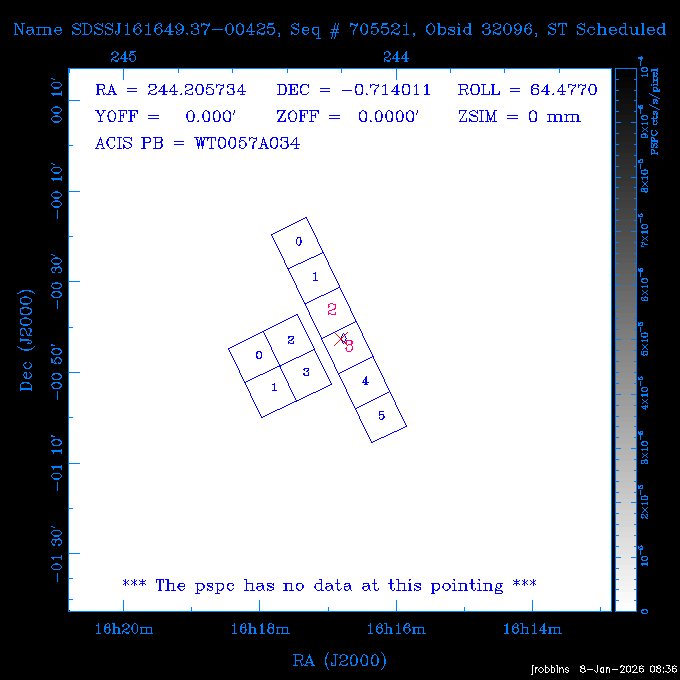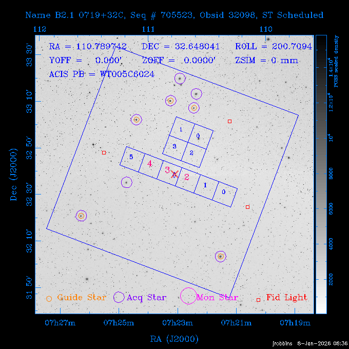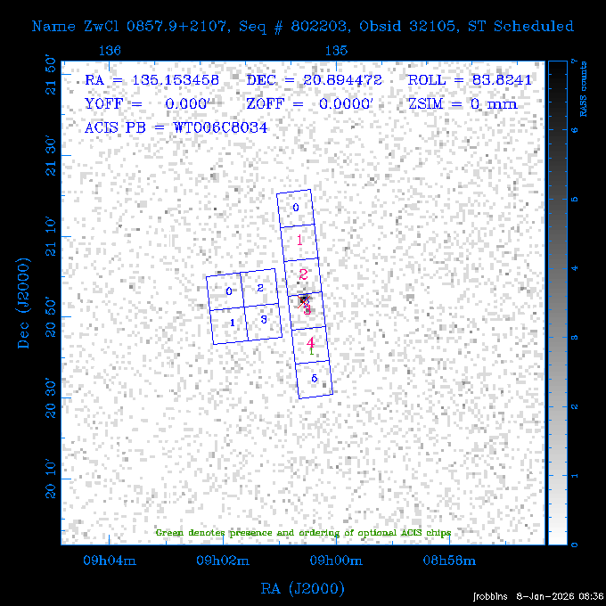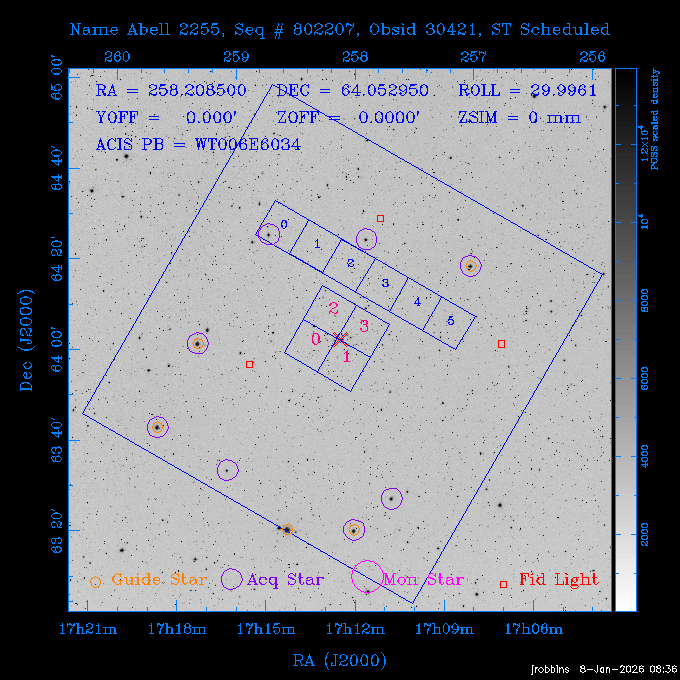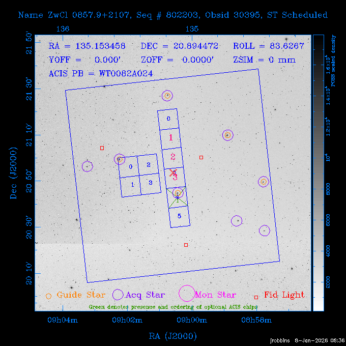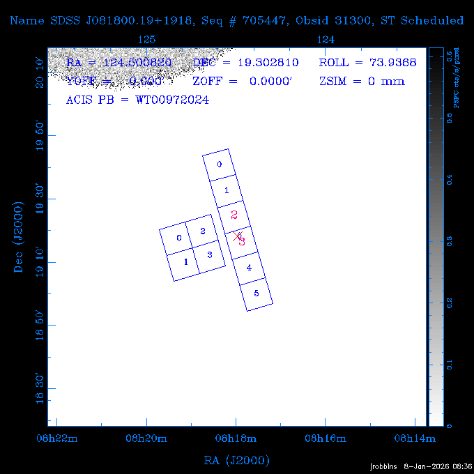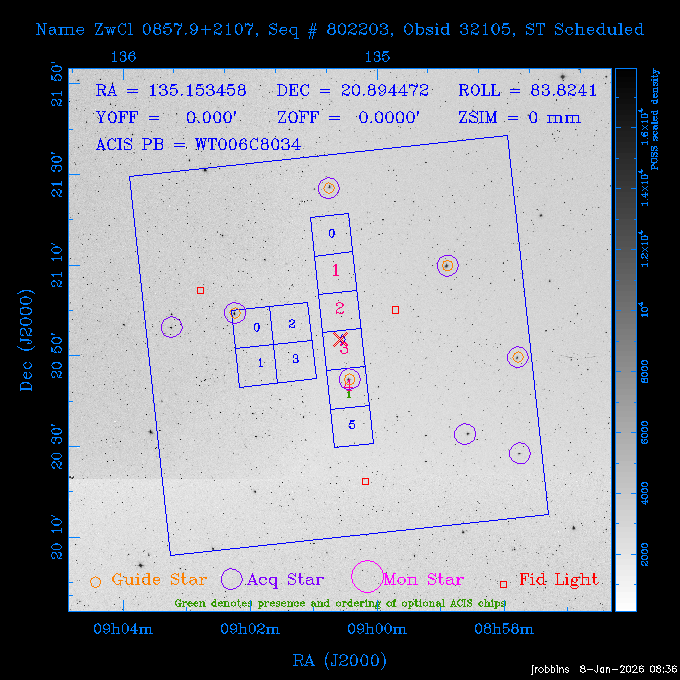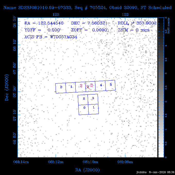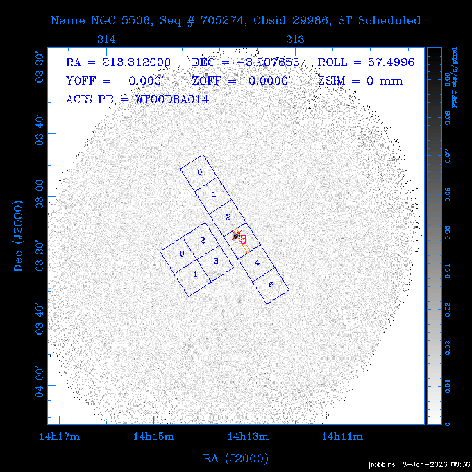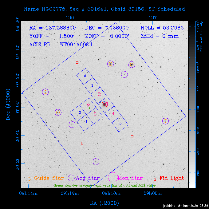Seq # NB ObsID Constr. Target Start Time SI Grat Active Chips RA Dec Roll Pitch Slew Overlays ------ --- ----- ------- -------------------- --------------------- ----- ------ ---- ----------------- -------- -------- ------ ------ ------ ------------- 802245 31322 0 ACT-CLJ0808.7+1420 2025:363:03:18:51.889 19.5 ACIS-S NONE S2,S3 122.1975 14.3500 65.04 155.41 88.82 dss pspc rass 705288 30000 0 4C +05.57 2025:363:09:17:52.544 14.6 ACIS-S NONE S2,S3,S4 205.6818 5.0756 61.00 76.13 83.30 dss pspc rass 601655 29660 0 NGC4571 2025:363:13:46:29.544 38.0 ACIS-S NONE I3,S2,S3,S4 189.2349 14.2174 58.50 94.84 19.33 dss pspc rass 705444 31297 0 SDSS J074932.95+2834 2025:364:00:50:39.495 14.8 ACIS-S NONE S2,S3 117.3873 28.5685 103.54 162.58 69.00 dss pspc rass 705288 32083 0 4C +05.57 2025:364:05:32:00.113 16.5 ACIS-S NONE S2,S3,S4 205.6818 5.0756 64.74 76.95 86.30 dss pspc rass 705412 31265 0 SDSS J080010.70+3124 2025:364:10:42:00.288 13.0 ACIS-S NONE S2,S3 120.0446 31.4159 109.02 159.92 84.24 dss pspc rass 705288 32084 0 4C +05.57 2025:364:14:52:59.719 17.3 ACIS-S NONE S2,S3,S4 205.6818 5.0756 61.00 77.32 84.71 dss pspc rass ---- 41843 CAL-ER (PER01) 2025:364:20:17:47.068 3.0 -- -- 108.0000 24.0000 94.86 172.45 94.93 ---- 41842 CAL-ER (PER02) 2025:364:21:34:05.651 3.0 -- -- 105.2458 30.1343 144.30 171.52 48.60 ---- 41841 CAL-ER (PER03) 2025:364:23:05:47.322 3.0 -- -- 283.5439 34.1864 356.07 57.42 117.88 ---- 41840 CAL-ER (PER04) 2025:365:00:30:20.222 3.0 -- -- 97.4121 59.9601 183.98 143.11 85.72 ---- 41839 CAL-ER (PER05) 2025:365:03:20:00.000 3.0 -- -- 105.0000 28.0000 137.13 173.43 52.09 ---- 41838 CAL-ER (PER06) 2025:365:04:50:45.843 3.0 -- -- 250.2808 29.6778 31.97 60.12 113.69 802207 30426 0 Abell 2255 2025:365:07:13:24.904 12.0 ACIS-I NONE I0,I1,I2,I3 258.2085 64.0529 16.02 88.85 36.07 dss pspc rass 802196 30291 0 Perseus cluster 2025:365:11:06:15.118 15.7 ACIS-I NONE I0,I1,I2,I3 49.9508 41.5117 262.52 134.22 78.02 dss pspc rass 802207 32088 0 Abell 2255 2025:365:16:00:40.645 19.4 ACIS-I NONE I0,I1,I2,I3 258.2085 64.0529 17.02 88.91 77.66 dss pspc rass 705434 P1 31287 0 UGC 04040 2025:365:21:57:35.620 10.0 ACIS-S NONE S2,S3 117.4621 33.9623 119.99 161.96 81.37 dss pspc rass ---- 41837 CAL-ER (IAT01) 2026:001:01:15:51.828 0.0 -- -- 179.0000 -23.0000 64.09 91.45 92.72 503632 31587 0 sn1006 NE 2026:001:01:41:20.234 12.5 ACIS-I NONE I0,I1,I2,I3 225.9370 -41.7851 90.61 49.28 43.21 dss pspc rass ---- 41836 CAL-ER (IAT02) 2026:001:05:35:42.118 0.0 -- -- 103.0000 -66.0000 1.50 90.92 67.64 802204 30403 0 ClG J0242-2132 2026:001:06:05:35.286 30.0 ACIS-S NONE I3,S1,S2,S3 40.6496 -21.5406 289.99 105.92 63.16 dss pspc rass 705520 CCT 32076 0 B2.4 0628+21B 2026:001:14:56:54.725 17.6 ACIS-S NONE S2,S3,S4 97.8768 21.8520 299.01 176.18 71.21 dss pspc rass 705287 29999 2 2MASX J01110461-4558 2026:001:20:28:00.005 22.0 ACIS-S NONE I3,S2,S3,S4 17.7693 -45.9788 292.48 77.44 100.15 dss pspc rass 790396 31732 3 MKN421 2026:002:03:26:50.914 27.7 ACIS-S LETG S1,S2,S3 166.1133 38.2088 73.00 124.16 165.07 dss pspc rass ---- 41835 CAL-ER (PER29) 2026:002:11:26:44.747 0.9 -- -- 178.0820 37.0300 79.14 114.87 16.49 ---- 41834 CAL-ER (PER07) 2026:002:12:11:50.252 3.0 -- -- 108.0000 24.0000 101.47 175.07 62.59 ---- 41833 CAL-ER (PER08) 2026:002:13:41:53.335 1.0 -- -- 102.4473 20.0103 353.20 177.07 110.48 ---- 41832 CAL-ER (PER09) 2026:002:14:39:04.747 1.0 -- -- 5.8612 -53.8990 278.62 67.62 112.61 ---- 41831 CAL-ER (PER10) 2026:002:15:36:12.434 3.0 -- -- 102.4473 20.0103 351.60 177.07 112.33 ---- 41830 CAL-ER (PER11) 2026:002:17:06:40.350 3.0 -- -- 5.8612 -53.8986 278.52 67.57 112.34 ---- 41829 CAL-ER (PER12) 2026:002:20:50:00.000 3.0 -- -- 101.1000 21.7000 302.28 177.75 111.42 601666 31971 0 IC5273 2026:002:23:46:55.254 16.0 ACIS-S NONE I3,S2,S3,S4 344.8613 -37.7029 272.78 54.18 123.45 dss pspc rass 201903 CCT 32077 0 HEP G189.006+04.012 2026:003:04:56:03.022 10.0 ACIS-I NONE I0,I1,I2,I3 95.2267 23.0764 270.09 172.32 121.33 dss pspc rass 601666 32094 0 IC5273 2026:003:08:25:10.354 11.6 ACIS-S NONE I3,S2,S3,S4 344.8613 -37.7029 272.53 53.87 121.30 dss pspc rass ---- 41828 CAL-ER (IAT03) 2026:003:12:19:12.643 0.9 -- -- 212.7833 -41.8443 83.00 61.22 113.42 201904 CCT 32078 0 2RXS J072007.5+21591 2026:003:13:16:03.580 9.7 ACIS-S NONE S2,S3 110.0307 21.9823 79.69 174.28 115.50 dss pspc rass 503632 32093 0 sn1006 NE 2026:003:16:41:05.285 17.4 ACIS-I NONE I0,I1,I2,I3 225.9370 -41.7851 86.91 51.57 125.38 dss pspc rass 201904 CCT 32095 0 2RXS J072007.5+21591 2026:003:22:14:17.947 9.7 ACIS-S NONE S2,S3 110.0307 21.9823 74.00 174.66 124.70 dss pspc rass ---- 41827 CAL-ER (IAT04) 2026:004:01:29:15.003 0.9 -- -- 189.3532 2.8698 67.34 95.84 80.03 601652 30169 0 NGC4536 2026:004:02:01:23.935 27.4 ACIS-S NONE I3,S2,S3,S4 188.6128 2.1879 54.00 96.28 13.41 dss pspc rass 601633 29638 0 NGC1317 2026:004:10:21:34.406 42.4 ACIS-S NONE I3,S2,S3,S4 50.6844 -37.1038 310.29 101.33 129.19 dss pspc rass ---- 41826 CAL-ER (IAT05) 2026:004:22:38:48.307 0.9 -- -- 95.6382 15.4205 309.69 168.22 68.17 705413 31266 0 SDSS J080704.32+2102 2026:004:23:41:09.970 10.8 ACIS-S NONE S2,S3 121.7680 21.0357 80.64 164.80 140.30 dss pspc rass ---- 41825 CAL-ER (PER13) 2026:005:03:04:55.861 3.0 -- -- 108.0000 24.0000 121.02 177.46 37.36 ---- 41824 CAL-ER (PER14) 2026:005:04:36:55.762 6.0 -- -- 103.0000 24.0000 242.24 177.18 119.24 ---- 41823 CAL-ER (PER15) 2026:005:06:51:31.605 3.0 -- -- 6.0650 24.9030 294.52 91.17 85.94 ---- 41822 CAL-ER (PER16) 2026:005:12:15:00.000 0.9 -- -- 103.0000 24.0000 244.55 176.86 85.92 ---- 41821 CAL-ER (PER17) 2026:005:13:11:35.669 0.9 -- -- 108.0000 24.0000 128.22 177.79 114.35 705232 30212 0 8C 1435+638 2026:005:14:02:21.200 19.0 ACIS-S NONE S2,S3 219.1908 63.6105 59.80 100.59 80.94 dss pspc rass 802196 32086 0 Perseus cluster 2026:005:19:52:59.208 17.0 ACIS-I NONE I0,I1,I2,I3,S2 49.9508 41.5117 266.28 129.52 83.10 dss pspc rass 705328 30537 0 BOSS1348 2026:006:01:19:18.635 30.0 ACIS-I NONE I0,I1,I2,I3 207.0600 23.9800 60.00 90.23 123.71 dss 