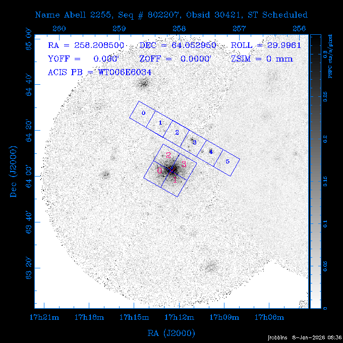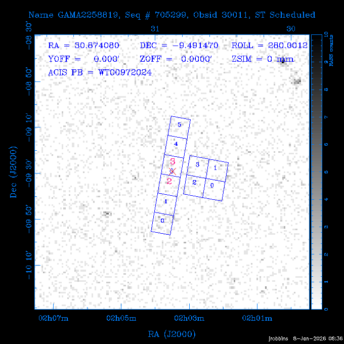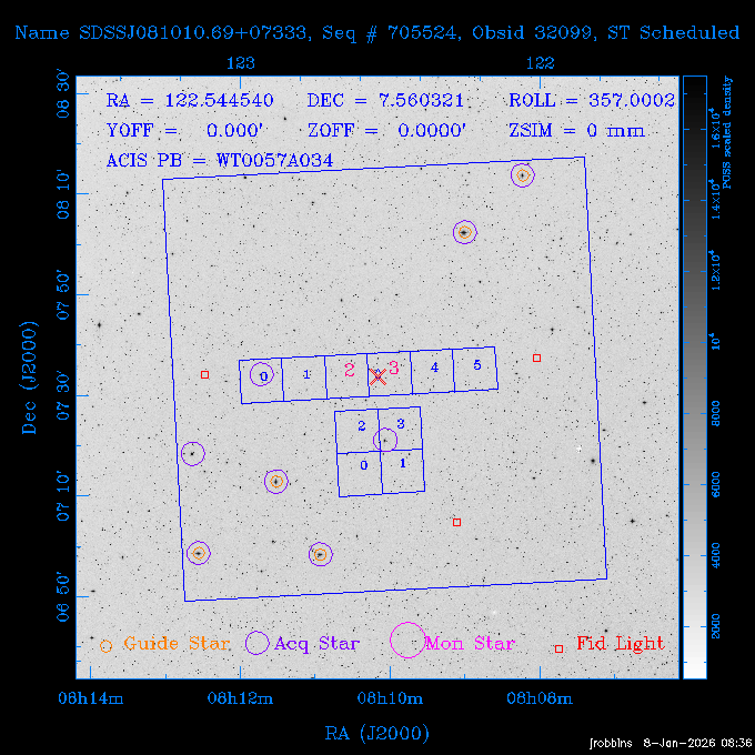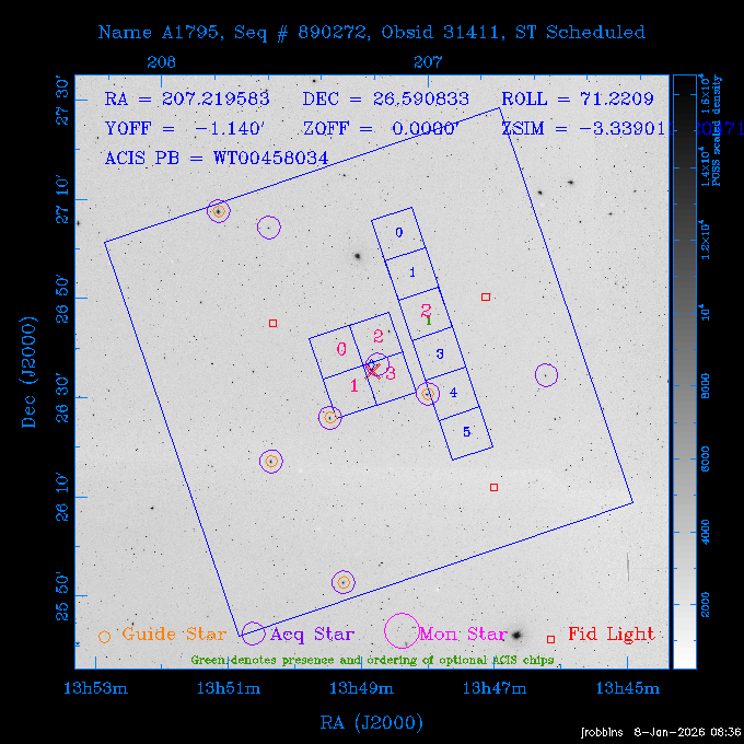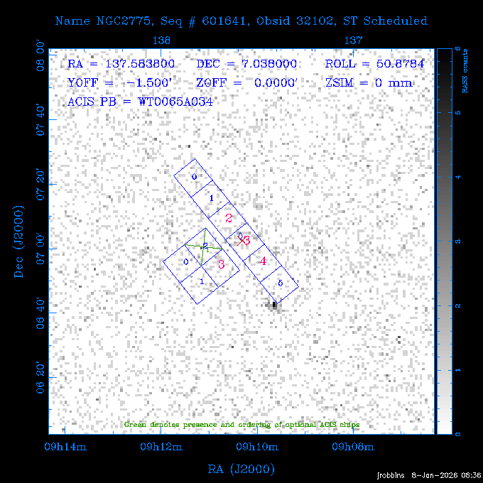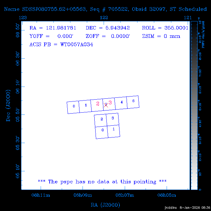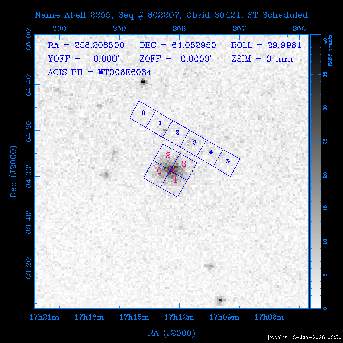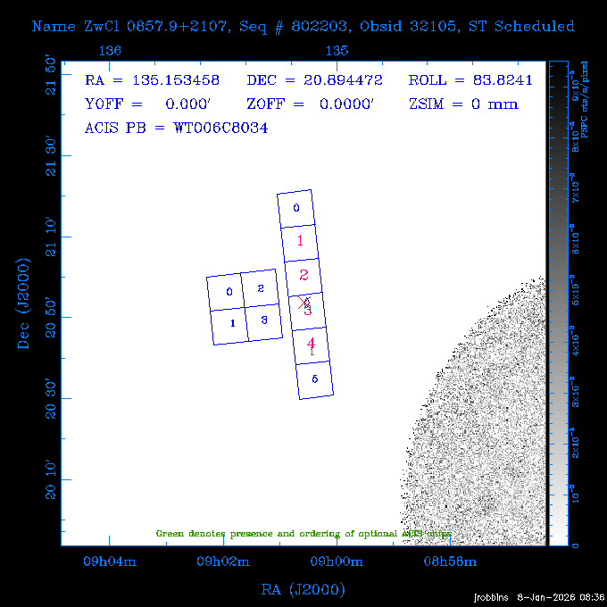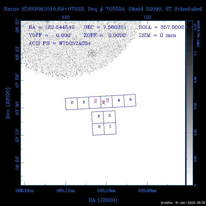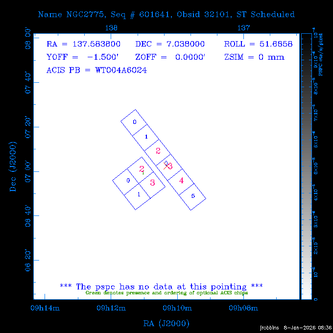 Seq # NB ObsID Constr. Target Start Time SI Grat Active Chips RA Dec Roll Pitch Slew Overlays ------ --- ----- ------- -------------------- --------------------- ----- ------ ---- ----------------- -------- -------- ------ ------ ------ ------------- 802245 31322 0 ACT-CLJ0808.7+1420 2025:363:03:18:51.889 19.5 ACIS-S NONE S2,S3 122.1975 14.3500 65.04 155.41 88.82 dss pspc rass 705288 30000 0 4C +05.57 2025:363:09:17:52.544 14.6 ACIS-S NONE S2,S3,S4 205.6818 5.0756 61.00 76.13 83.30 dss pspc rass 601655 29660 0 NGC4571 2025:363:13:46:29.544 38.0 ACIS-S NONE I3,S2,S3,S4 189.2349 14.2174 58.50 94.84 19.33 dss pspc rass 705444 31297 0 SDSS J074932.95+2834 2025:364:00:50:39.495 14.8 ACIS-S NONE S2,S3 117.3873 28.5685 103.54 162.58 69.00 dss pspc rass 705288 32083 0 4C +05.57 2025:364:05:32:00.113 16.5 ACIS-S NONE S2,S3,S4 205.6818 5.0756 64.74 76.95 86.30 dss pspc rass 705412 31265 0 SDSS J080010.70+3124 2025:364:10:42:00.288 13.0 ACIS-S NONE S2,S3 120.0446 31.4159 109.02 159.92 84.24 dss pspc rass 705288 32084 0 4C +05.57 2025:364:14:52:59.719 17.3 ACIS-S NONE S2,S3,S4 205.6818 5.0756 61.00 77.32 84.71 dss pspc rass ---- 41843 CAL-ER (PER01) 2025:364:20:17:47.068 3.0 -- -- 108.0000 24.0000 94.86 172.45 94.93 ---- 41842 CAL-ER (PER02) 2025:364:21:34:05.651 3.0 -- -- 105.2458 30.1343 144.30 171.52 48.60 ---- 41841 CAL-ER (PER03) 2025:364:23:05:47.322 3.0 -- -- 283.5439 34.1864 356.07 57.42 117.88 ---- 41840 CAL-ER (PER04) 2025:365:00:30:20.222 3.0 -- -- 97.4121 59.9601 183.98 143.11 85.72 ---- 41839 CAL-ER (PER05) 2025:365:03:20:00.000 3.0 -- -- 105.0000 28.0000 137.13 173.43 52.09 ---- 41838 CAL-ER (PER06) 2025:365:04:50:45.843 3.0 -- -- 250.2808 29.6778 31.97 60.12 113.69 802207 30426 0 Abell 2255 2025:365:07:13:24.904 12.0 ACIS-I NONE I0,I1,I2,I3 258.2085 64.0529 16.02 88.85 36.07 dss pspc rass 802196 30291 0 Perseus cluster 2025:365:11:06:15.118 15.7 ACIS-I NONE I0,I1,I2,I3 49.9508 41.5117 262.52 134.22 78.02 dss pspc rass 802207 32088 0 Abell 2255 2025:365:16:00:40.645 19.4 ACIS-I NONE I0,I1,I2,I3 258.2085 64.0529 17.02 88.91 77.66 dss pspc rass 705434 P1 31287 0 UGC 04040 2025:365:21:57:35.620 10.0 ACIS-S NONE S2,S3 117.4621 33.9623 119.99 161.96 81.37 dss pspc rass ---- 41837 CAL-ER (IAT01) 2026:001:01:15:51.828 0.0 -- -- 179.0000 -23.0000 64.09 91.45 92.72 503632 31587 0 sn1006 NE 2026:001:01:41:20.234 12.5 ACIS-I NONE I0,I1,I2,I3 225.9370 -41.7851 90.61 49.28 43.21 dss pspc rass ---- 41836 CAL-ER (IAT02) 2026:001:05:35:42.118 0.0 -- -- 103.0000 -66.0000 1.50 90.92 67.64 802204 30403 0 ClG J0242-2132 2026:001:06:05:35.286 30.0 ACIS-S NONE I3,S1,S2,S3 40.6496 -21.5406 289.99 105.92 63.16 dss pspc rass 705520 CCT 32076 0 B2.4 0628+21B 2026:001:14:56:54.725 17.6 ACIS-S NONE S2,S3,S4 97.8768 21.8520 299.01 176.18 71.21 dss pspc rass 705287 29999 2 2MASX J01110461-4558 2026:001:20:28:00.005 22.0 ACIS-S NONE I3,S2,S3,S4 17.7693 -45.9788 292.48 77.44 100.15 dss pspc rass 790396 31732 3 MKN421 2026:002:03:26:50.914 27.7 ACIS-S LETG S1,S2,S3 166.1133 38.2088 73.00 124.16 165.07 dss pspc rass ---- 41835 CAL-ER (PER29) 2026:002:11:26:44.747 0.9 -- -- 178.0820 37.0300 79.14 114.87 16.49 ---- 41834 CAL-ER (PER07) 2026:002:12:11:50.252 3.0 -- -- 108.0000 24.0000 101.47 175.07 62.59 ---- 41833 CAL-ER (PER08) 2026:002:13:41:53.335 1.0 -- -- 102.4473 20.0103 353.20 177.07 110.48 ---- 41832 CAL-ER (PER09) 2026:002:14:39:04.747 1.0 -- -- 5.8612 -53.8990 278.62 67.62 112.61 ---- 41831 CAL-ER (PER10) 2026:002:15:36:12.434 3.0 -- -- 102.4473 20.0103 351.60 177.07 112.33 ---- 41830 CAL-ER (PER11) 2026:002:17:06:40.350 3.0 -- -- 5.8612 -53.8986 278.52 67.57 112.34 ---- 41829 CAL-ER (PER12) 2026:002:20:50:00.000 3.0 -- -- 101.1000 21.7000 302.28 177.75 111.42 601666 31971 0 IC5273 2026:002:23:46:55.254 16.0 ACIS-S NONE I3,S2,S3,S4 344.8613 -37.7029 272.78 54.18 123.45 dss pspc rass 201903 CCT 32077 0 HEP G189.006+04.012 2026:003:04:56:03.022 10.0 ACIS-I NONE I0,I1,I2,I3 95.2267 23.0764 270.09 172.32 121.33 dss pspc rass 601666 32094 0 IC5273 2026:003:08:25:10.354 11.6 ACIS-S NONE I3,S2,S3,S4 344.8613 -37.7029 272.53 53.87 121.30 dss pspc rass ---- 41828 CAL-ER (IAT03) 2026:003:12:19:12.643 0.9 -- -- 212.7833 -41.8443 83.00 61.22 113.42 201904 CCT 32078 0 2RXS J072007.5+21591 2026:003:13:16:03.580 9.7 ACIS-S NONE S2,S3 110.0307 21.9823 79.69 174.28 115.50 dss pspc rass 503632 32093 0 sn1006 NE 2026:003:16:41:05.285 17.4 ACIS-I NONE I0,I1,I2,I3 225.9370 -41.7851 86.91 51.57 125.38 dss pspc rass 201904 CCT 32095 0 2RXS J072007.5+21591 2026:003:22:14:17.947 9.7 ACIS-S NONE S2,S3 110.0307 21.9823 74.00 174.66 124.70 dss pspc rass ---- 41827 CAL-ER (IAT04) 2026:004:01:29:15.003 0.9 -- -- 189.3532 2.8698 67.34 95.84 80.03 601652 30169 0 NGC4536 2026:004:02:01:23.935 27.4 ACIS-S NONE I3,S2,S3,S4 188.6128 2.1879 54.00 96.28 13.41 dss pspc rass 601633 29638 0 NGC1317 2026:004:10:21:34.406 42.4 ACIS-S NONE I3,S2,S3,S4 50.6844 -37.1038 310.29 101.33 129.19 dss pspc rass ---- 41826 CAL-ER (IAT05) 2026:004:22:38:48.307 0.9 -- -- 95.6382 15.4205 309.69 168.22 68.17 705413 31266 0 SDSS J080704.32+2102 2026:004:23:41:09.970 10.8 ACIS-S NONE S2,S3 121.7680 21.0357 80.64 164.80 140.30 dss pspc rass ---- 41825 CAL-ER (PER13) 2026:005:03:04:55.861 3.0 -- -- 108.0000 24.0000 121.02 177.46 37.36 ---- 41824 CAL-ER (PER14) 2026:005:04:36:55.762 6.0 -- -- 103.0000 24.0000 242.24 177.18 119.24 ---- 41823 CAL-ER (PER15) 2026:005:06:51:31.605 3.0 -- -- 6.0650 24.9030 294.52 91.17 85.94 ---- 41822 CAL-ER (PER16) 2026:005:12:15:00.000 0.9 -- -- 103.0000 24.0000 244.55 176.86 85.92 ---- 41821 CAL-ER (PER17) 2026:005:13:11:35.669 0.9 -- -- 108.0000 24.0000 128.22 177.79 114.35 705232 30212 0 8C 1435+638 2026:005:14:02:21.200 19.0 ACIS-S NONE S2,S3 219.1908 63.6105 59.80 100.59 80.94 dss pspc rass 802196 32086 0 Perseus cluster 2026:005:19:52:59.208 17.0 ACIS-I NONE I0,I1,I2,I3,S2 49.9508 41.5117 266.28 129.52 83.10 dss pspc rass 705328 30537 0 BOSS1348 2026:006:01:19:18.635 30.0 ACIS-I NONE I0,I1,I2,I3 207.0600 23.9800 60.00 90.23 123.71 dss 