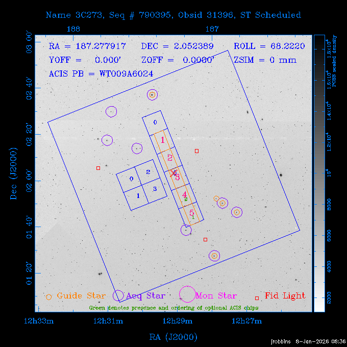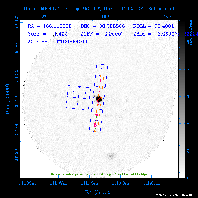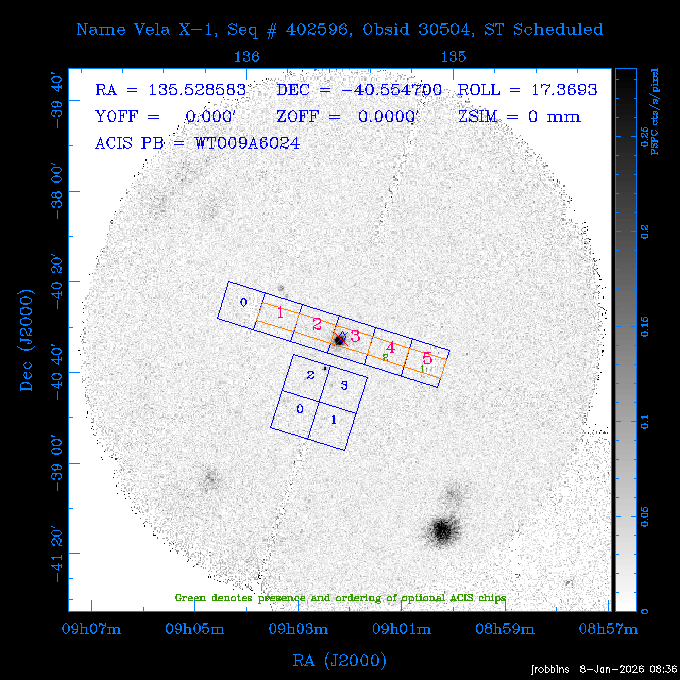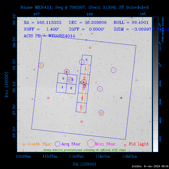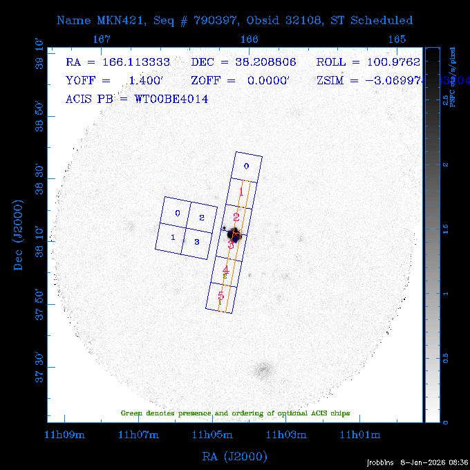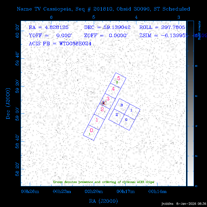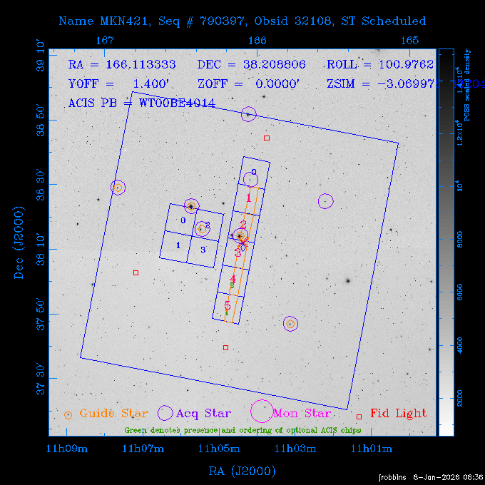 Seq # NB ObsID Constr. Target Start Time SI Grat Active Chips RA Dec Roll Pitch Slew Overlays ------ --- ----- ------- -------------------- --------------------- ----- ------ ---- ----------------- -------- -------- ------ ------ ------ ------------- ---- 41800 CAL-ER (IAT01) 2026:012:01:29:14.144 0.9 -- -- 132.8000 10.5000 56.59 158.12 84.57 890273 31412 2 A1795 2026:012:02:18:30.282 15.3 ACIS-S NONE I2,I3,S1,S2,S3 207.2196 26.5908 71.00 96.23 81.39 dss pspc rass 802203 30395 0 ZwCl 0857.9+2107 2026:012:07:04:07.602 10.0 ACIS-S NONE S1,S2,S3 135.1535 20.8945 83.62 159.80 68.05 dss pspc rass 705227 30193 0 NGC5728 2026:012:10:26:49.982 13.0 ACIS-S NONE S2,S3 220.5995 -17.2531 70.00 68.36 92.43 dss pspc rass 802203 32105 0 ZwCl 0857.9+2107 2026:012:14:39:32.582 10.0 ACIS-S NONE S1,S2,S3,S4 135.1535 20.8945 83.82 160.11 92.45 dss pspc rass 705227 32103 0 NGC5728 2026:012:18:02:14.096 13.3 ACIS-S NONE S2,S3 220.5995 -17.2531 71.00 68.67 92.36 dss pspc rass 802203 32106 0 ZwCl 0857.9+2107 2026:012:22:19:55.835 9.9 ACIS-S NONE S1,S2,S3,S4 135.1535 20.8945 84.04 160.42 92.38 dss pspc rass ---- 41799 CAL-ER (PER01) 2026:013:01:44:00.963 3.0 -- -- 240.0000 -15.0000 74.13 51.73 108.88 ---- 41798 CAL-ER (PER02) 2026:013:03:13:42.833 3.0 -- -- 135.1535 20.8945 84.26 160.63 108.89 ---- 41797 CAL-ER (PER03) 2026:013:05:00:00.000 3.0 -- -- 239.6516 -14.9042 74.07 52.22 108.54 ---- 41796 CAL-ER (PER04) 2026:013:06:30:30.330 3.0 -- -- 342.6876 -63.1555 240.78 52.59 112.52 ---- 41795 CAL-ER (PER05) 2026:013:07:49:25.624 3.0 -- -- 86.0881 -40.0496 331.20 112.96 60.40 ---- 41794 CAL-ER (PER06) 2026:013:10:20:00.000 0.9 -- -- 97.7581 20.0772 278.13 164.11 80.64 201810 30090 0 TV Cassiopeia 2026:013:12:42:56.653 37.0 ACIS-S HETG S0,S1,S2,S3,S4,S5 4.8281 59.1390 297.82 98.70 88.15 dss pspc rass 705523 CCT 32098 0 B2.1 0719+32C 2026:013:23:30:43.890 16.0 ACIS-S NONE S2,S3,S4 110.7897 32.6480 200.70 168.09 70.29 dss pspc rass 901896 31515 0 Cyg X-2 2026:014:04:39:48.890 14.5 HRC-I HETG 326.1715 38.3214 328.81 66.28 101.89 dss pspc rass 790397 31398 3 MKN421 2026:014:09:19:50.181 15.0 ACIS-S LETG S1,S2,S3,S4,S5 166.1133 38.2088 96.39 133.80 102.85 dss pspc rass 705274 29986 0 NGC 5506 2026:014:13:59:32.535 16.2 ACIS-S HETG S3 213.3120 -3.2077 57.50 81.98 63.93 dss pspc rass 601641 30156 0 NGC2775 2026:014:19:02:17.699 11.0 ACIS-S NONE I2,I3,S2,S3,S4 137.5838 7.0380 53.21 154.87 76.55 dss pspc rass 790395 31396 2 3C273 2026:014:22:32:55.876 28.0 ACIS-S HETG S1,S2,S3,S4,S5 187.2779 2.0524 68.22 108.48 53.11 dss pspc rass 705447 P1 31300 0 SDSS J081800.19+1918 2026:015:06:49:20.041 10.0 ACIS-S NONE S2,S3 124.5008 19.3028 73.93 172.43 64.06 dss pspc rass 705521 CCT 32096 0 SDSSJ161649.37-00425 2026:015:10:18:02.240 10.0 ACIS-S NONE S2,S3 244.2057 -0.7140 64.48 55.22 119.42 dss pspc rass 705447 32107 0 SDSS J081800.19+1918 2026:015:13:46:44.479 9.9 ACIS-S NONE S2,S3 124.5008 19.3028 73.90 172.72 119.42 dss pspc rass ---- 41793 CAL-ER (PER07) 2026:015:17:10:27.989 3.0 -- -- 115.7181 18.1037 336.05 176.71 100.93 ---- 41792 CAL-ER (PER08) 2026:015:19:30:00.000 3.0 -- -- 341.5901 -57.1321 240.74 48.37 128.39 ---- 41791 CAL-ER (PER09) 2026:015:21:55:00.000 3.0 -- -- 115.7181 18.1037 332.68 176.67 128.34 ---- 41790 CAL-ER (PER10) 2026:015:23:16:46.963 3.0 -- -- 75.4066 -45.3795 320.05 103.39 73.27 ---- 41789 CAL-ER (PER11) 2026:016:02:00:00.000 0.9 -- -- 348.8445 -13.9225 285.93 49.24 79.40 ---- 41788 CAL-ER (PER12) 2026:016:03:04:44.753 0.9 -- -- 255.8770 6.6120 54.90 49.40 151.03 890272 31411 2 A1795 2026:016:04:51:30.666 20.0 ACIS-I NONE I0,I1,I2,I3,S2 207.2196 26.5908 71.22 99.62 50.34 dss pspc rass 601641 32101 0 NGC2775 2026:016:10:57:59.610 11.0 ACIS-S NONE I2,I3,S2,S3,S4 137.5838 7.0380 51.69 156.44 79.42 dss pspc rass 705227 32104 0 NGC5728 2026:016:14:35:54.373 10.0 ACIS-S NONE S2,S3 220.5995 -17.2531 70.00 72.62 85.86 dss pspc rass 802207 30421 0 Abell 2255 2026:016:17:57:39.349 38.0 ACIS-I NONE I0,I1,I2,I3 258.2085 64.0529 30.01 90.49 88.12 dss pspc rass ---- 41787 CAL-ER (IAT02) 2026:017:04:56:01.802 0.0 -- -- 169.9697 30.8334 89.56 133.26 63.18 601641 32102 0 NGC2775 2026:017:05:25:40.804 10.0 ACIS-S NONE I3,S2,S3,S4 137.5838 7.0380 50.88 157.16 62.10 dss pspc rass 402596 30504 1 Vela X-1 2026:017:08:40:35.185 15.0 ACIS-S HETG S1,S2,S3,S4,S5 135.5286 -40.5547 17.36 116.70 57.33 dss pspc rass 705522 CCT 32097 0 SDSSJ080755.62+05563 2026:017:13:17:27.771 10.0 ACIS-S NONE S2,S3 121.9818 5.9439 355.00 164.90 51.19 dss pspc rass 705299 30011 0 GAMA2258819 2026:017:16:44:22.311 19.0 ACIS-S NONE S2,S3 30.8741 -9.4915 280.00 88.11 111.34 dss pspc rass 705524 CCT 32099 0 SDSSJ081010.69+07333 2026:017:22:41:48.443 10.0 ACIS-S NONE S2,S3 122.5445 7.5603 357.00 166.55 113.71 dss pspc rass ---- 41786 CAL-ER (IAT03) 2026:018:01:56:05.727 0.0 -- -- 169.8510 -13.8255 55.93 119.85 74.80 705274 32100 0 NGC 5506 2026:018:02:21:49.876 20.3 ACIS-S HETG S3 213.3120 -3.2077 67.00 85.49 44.38 dss pspc rass ---- 41785 CAL-ER (PER13) 2026:018:08:36:33.993 3.0 -- -- 123.5325 20.9826 96.02 176.66 91.48 ---- 41784 CAL-ER (PER14) 2026:018:10:14:34.850 3.0 -- -- 116.0494 22.3688 245.04 175.87 146.31 ---- 41783 CAL-ER (PER15) 2026:018:11:48:22.697 3.0 -- -- 343.0235 3.5152 301.63 48.47 127.34 ---- 41782 CAL-ER (PER16) 2026:018:14:15:00.000 3.0 -- -- 35.4000 41.8000 282.40 107.26 60.41 ---- 41781 CAL-ER (PER17) 2026:018:17:30:00.000 0.9 -- -- 116.0494 22.3687 246.04 175.56 69.59 ---- 41780 CAL-ER (PER18) 2026:018:18:29:28.797 0.9 -- -- 343.0235 3.5152 301.73 48.19 127.33 ---- 41779 CAL-ER (PER19) 2026:018:19:29:06.547 0.9 -- -- 255.8770 6.6120 57.14 51.52 128.01 790397 32108 3 MKN421 2026:018:20:42:29.632 15.0 ACIS-S LETG S1,S2,S3,S4,S5 166.1133 38.2088 100.96 137.02 85.72 dss pspc rass