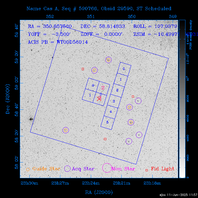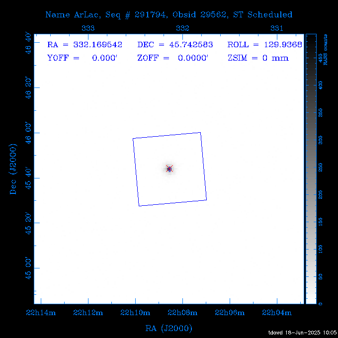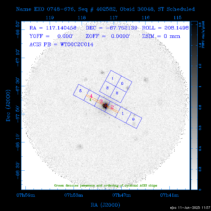 Seq # NB ObsID Constr. Target Start Time SI Grat Active Chips RA Dec Roll Pitch Slew Overlays ------ --- ----- ------- -------------------- --------------------- ----- ------ ---- ----------------- -------- -------- ------ ------ ------ ------------- ---- 41880 CAL-ER (PER01) 2025:349:02:00:00.000 3.0 -- -- 210.7817 -21.8656 77.94 47.37 128.42 ---- 41879 CAL-ER (PER02) 2025:349:06:00:00.000 3.0 -- -- 151.9000 3.6000 66.51 110.36 62.92 ---- 41878 CAL-ER (CAL01) 2025:349:07:30:00.000 0.9 -- -- 166.5294 -10.5228 66.03 91.35 20.33 ---- 41877 CAL-ER (PER03) 2025:349:08:24:19.718 0.9 -- -- 269.1556 71.9113 354.00 95.29 104.15 300569 31116 0 ZTF J0546+3843 2025:349:09:45:31.508 19.8 ACIS-S NONE S2,S3 86.6142 38.7204 169.98 164.20 69.65 dss pspc rass 503638 31160 3 GRB 221009A 2025:349:15:56:41.700 15.1 ACIS-S NONE I3,S2,S3,S4 288.2646 19.7734 329.08 49.62 119.26 dss pspc rass 201902 CCT 32052 0 HEP G173.810-01.525 2025:349:20:50:49.853 10.1 ACIS-I NONE I0,I1,I2,I3 80.9893 33.3134 191.62 169.81 121.36 dss pspc rass 503638 31593 3 GRB 221009A 2025:350:00:21:38.404 15.0 ACIS-S NONE I3,S2,S3,S4 288.2646 19.7734 329.49 49.46 121.39 dss pspc rass 201901 CCT 32051 0 HEP G173.766-01.783 2025:350:05:14:04.107 10.1 ACIS-I NONE I0,I1,I2,I3 80.7049 33.2039 195.16 169.81 121.18 dss pspc rass 503638 32057 3 GRB 221009A 2025:350:08:44:50.134 15.0 ACIS-S NONE I3,S2,S3,S4 288.2646 19.7734 329.90 49.30 121.20 dss pspc rass 802196 30289 0 Perseus cluster 2025:350:13:32:12.794 10.0 ACIS-I NONE I0,I1,I2,I3 49.9508 41.5117 248.02 146.35 98.45 dss pspc rass ---- 41876 CAL-ER (IAT05) 2025:350:16:43:02.879 1.9 -- -- 80.4000 33.3000 199.22 169.55 39.09 503638 32058 3 GRB 221009A 2025:350:17:56:12.510 11.1 ACIS-S NONE S2,S3 288.2646 19.7734 327.11 49.12 120.72 dss pspc rass ---- 41875 CAL-ER (IAT01) 2025:350:21:25:52.896 0.0 -- -- 354.0212 22.4330 291.89 98.43 61.53 705403 31256 3 IRAS04416+1215 2025:350:22:00:49.090 12.4 ACIS-S NONE S2,S3 71.1199 12.3533 312.96 163.26 85.89 dss pspc rass 705245 29957 0 6dFGS gJ031612.2-380 2025:351:01:55:40.579 43.9 ACIS-S NONE S2,S3,S4 49.0509 -38.0197 325.38 110.13 57.11 dss pspc rass ---- 41874 CAL-ER (PER04) 2025:351:14:37:21.491 3.0 -- -- 82.6000 20.9000 317.05 176.59 68.16 ---- 41873 CAL-ER (PER05) 2025:351:19:00:00.000 3.0 -- -- 316.0854 -49.2249 255.73 47.18 129.29 ---- 41872 CAL-ER (CAL01) 2025:351:20:34:14.081 0.9 -- -- 82.6000 20.9000 313.94 176.41 129.31 ---- 41871 CAL-ER (PER08) 2025:351:21:31:29.563 0.9 -- -- 84.1000 27.7000 196.12 175.49 117.34 ---- 41870 CAL-ER (PER07) 2025:351:22:27:34.469 3.0 -- -- 267.7000 40.6000 357.77 64.00 112.04 ---- 41869 CAL-ER (PER09) 2025:351:23:54:43.263 3.0 -- -- 213.7139 -18.5969 74.86 48.42 97.41 705309 30243 0 Center of COSMOS-Web 2025:352:03:18:37.154 27.5 ACIS-I NONE I0,I1,I2,I3 150.0871 2.3882 65.31 114.42 65.95 dss pspc rass 705310 30245 0 Center of COSMOS-Web 2025:352:11:05:27.154 16.0 ACIS-I NONE I0,I1,I2,I3 149.9618 2.4338 65.22 114.87 0.16 dss pspc rass 601699 29889 0 NGVS J122636.42+1255 2025:352:15:56:05.116 19.0 ACIS-S NONE S2,S3 186.6518 12.9202 54.00 85.90 38.25 dss pspc rass 705514 CCT 32049 0 B2.4 0553+23 2025:352:21:48:35.848 16.0 ACIS-S NONE S2,S3,S4 89.2398 23.9189 99.93 177.52 91.56 dss pspc rass 503503 30115 1 GW170817 2025:353:02:56:46.589 19.0 ACIS-S NONE I2,I3,S1,S2,S3 197.4504 -23.3815 72.00 62.96 117.06 dss pspc rass ---- 41868 CAL-ER (IAT02) 2025:353:08:38:14.201 0.0 -- -- 125.0128 -46.2862 35.24 102.26 62.07 705403 32059 3 IRAS04416+1215 2025:353:09:15:03.767 14.0 ACIS-S NONE S2,S3 71.1199 12.3533 315.01 161.18 94.39 dss pspc rass ---- 41867 CAL-ER (IAT03) 2025:353:14:00:13.597 0.9 -- -- 97.9162 35.9581 140.88 164.50 163.49 705419 31272 0 SDSS J160318.74+1809 2025:353:14:57:05.170 12.5 ACIS-S NONE S2,S3 240.8281 18.1514 30.01 49.01 115.54 dss pspc rass ---- 41866 CAL-ER (IAT04) 2025:353:19:16:19.373 0.9 -- -- 324.5263 -40.4915 264.00 50.29 159.32 705403 32060 3 IRAS04416+1215 2025:353:20:12:04.795 12.1 ACIS-S NONE S2,S3 71.1199 12.3533 307.54 160.80 110.58 dss pspc rass 802260 P1 31461 0 ACT-CL J0223.9-3921 2025:354:00:03:11.458 20.2 ACIS-S NONE I2,I3,S1,S2,S3 36.0033 -39.3623 312.80 100.73 62.75 dss pspc rass ---- 41865 CAL-ER (CAL01) 2025:354:06:11:59.474 3.0 -- -- 82.6000 20.9000 297.64 174.34 77.66 ---- 41864 CAL-ER (PER11) 2025:354:07:34:15.319 3.0 -- -- 84.2874 27.4415 221.77 174.70 75.44 ---- 41863 CAL-ER (PER12) 2025:354:09:08:10.071 3.0 -- -- 289.1963 19.0278 333.36 47.14 127.86 ---- 41862 CAL-ER (PER10) 2025:354:12:00:00.000 3.0 -- -- 6.6000 59.8000 275.42 114.20 67.33 ---- 41861 CAL-ER (CAL01) 2025:354:15:00:00.000 0.9 -- -- 84.2874 27.4415 224.43 174.48 61.05 ---- 41860 CAL-ER (CAL01) 2025:354:15:59:37.204 0.9 -- -- 289.1963 19.0278 333.75 47.00 127.97 802196 30311 0 Perseus cluster 2025:354:18:03:08.347 13.0 ACIS-I NONE I0,I1,I2,I3 49.9508 41.5117 252.87 143.11 98.42 dss pspc rass 705512 CCT 32047 0 IIZw171 2025:354:22:10:27.324 10.0 ACIS-S NONE S2,S3 332.9745 18.6972 294.81 75.43 68.17 dss pspc rass 802196 32054 0 Perseus cluster 2025:355:01:27:46.458 11.0 ACIS-I NONE I0,I1,I2,I3 49.9508 41.5117 253.23 142.88 68.19 dss pspc rass 705513 CCT 32048 0 PG2304+042 2025:355:05:01:36.966 10.0 ACIS-S NONE S2,S3 346.7621 4.5492 290.00 80.52 67.54 dss pspc rass 802196 32055 0 Perseus cluster 2025:355:08:18:47.031 11.0 ACIS-I NONE I0,I1,I2,I3 49.9508 41.5117 253.54 142.66 67.50 dss pspc rass 705515 CCT 32050 0 SDSSJ233504.22-08450 2025:355:11:53:50.008 10.0 ACIS-S NONE S2,S3 353.7676 -8.7518 286.00 81.33 72.97 dss pspc rass 802196 32056 0 Perseus cluster 2025:355:15:12:12.341 11.0 ACIS-I NONE I0,I1,I2,I3 49.9508 41.5117 253.84 142.44 72.92 dss pspc rass 705310 32053 0 Center of COSMOS-Web 2025:355:19:05:01.958 14.0 ACIS-I NONE I0,I1,I2,I3 149.9618 2.4338 64.00 118.20 152.97 dss pspc rass