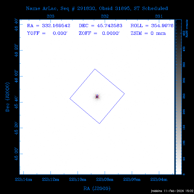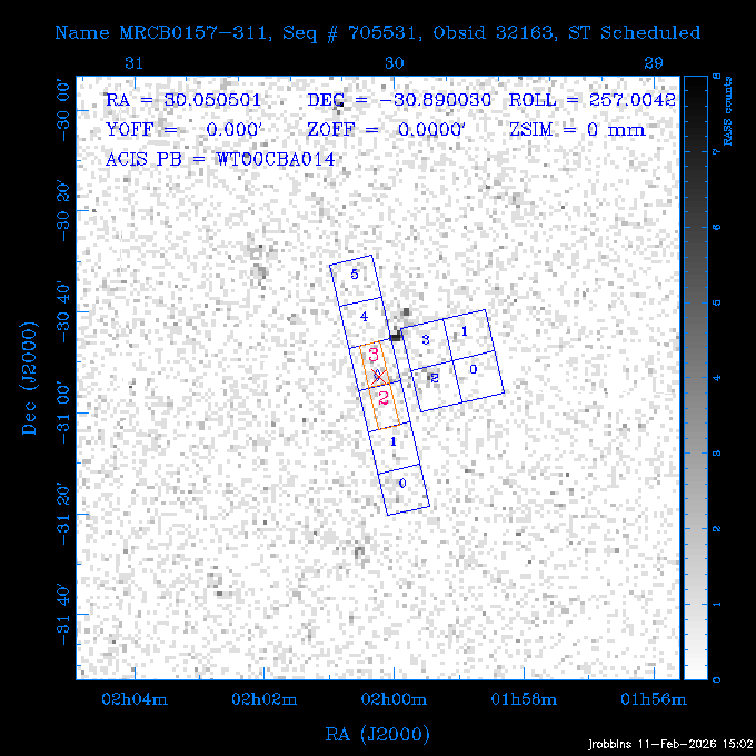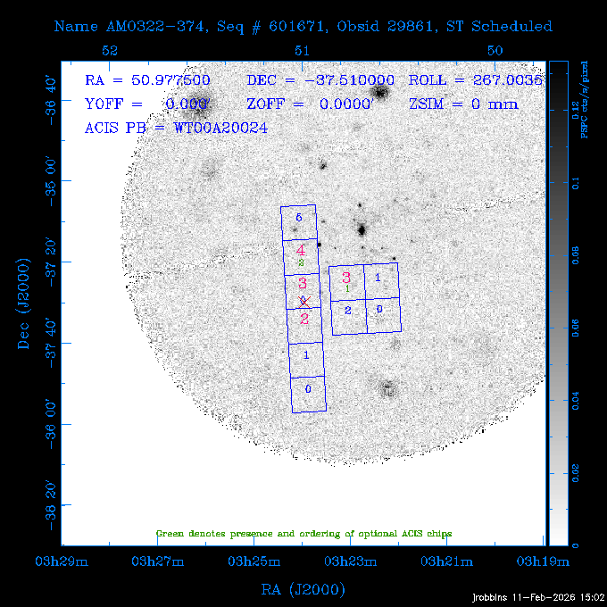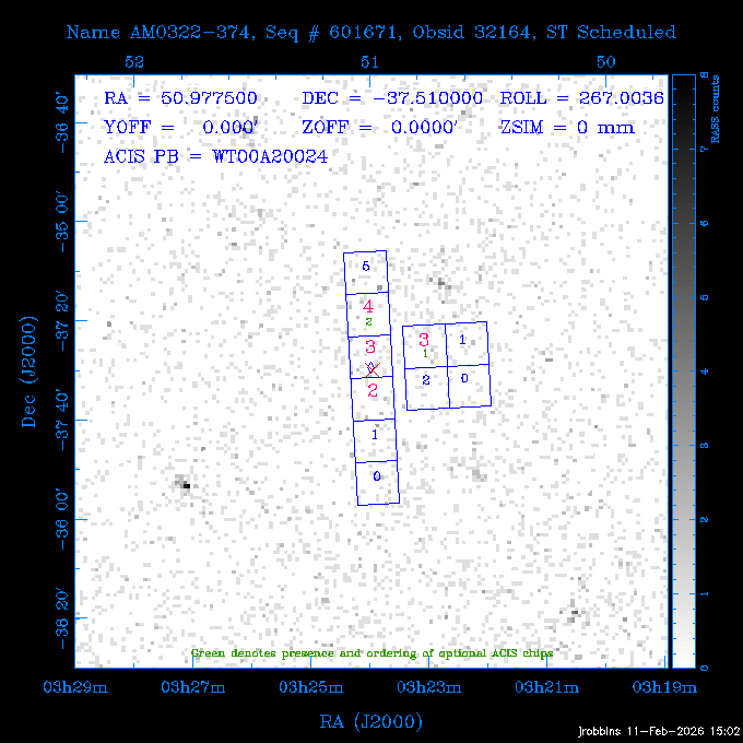 Seq # NB ObsID Constr. Target Start Time SI Grat Active Chips RA Dec Roll Pitch Slew Overlays ------ --- ----- ------- -------------------- --------------------- ----- ------ ---- ----------------- -------- -------- ------ ------ ------ ------------- 601671 29861 0 AM0322-374 2026:046:22:47:15.813 12.5 ACIS-S NONE I3,S2,S3,S4 50.9775 -37.5100 266.99 75.95 110.43 dss pspc rass 705321 30069 0 Center of COSMOS-Web 2026:047:02:55:19.593 10.5 ACIS-I NONE I0,I1,I2,I3 149.9502 2.0123 3.32 169.47 109.03 dss pspc rass 601671 32164 0 AM0322-374 2026:047:06:30:03.370 12.4 ACIS-S NONE I3,S2,S3,S4 50.9775 -37.5100 266.99 75.79 109.03 dss pspc rass ---- 41716 CAL-ER (PER01) 2026:047:10:35:15.796 3.0 -- -- 145.9000 7.0000 326.14 173.49 100.45 ---- 41715 CAL-ER (PER04) 2026:047:11:58:08.478 3.0 -- -- 154.7916 6.9818 42.84 172.62 78.20 ---- 41714 CAL-ER (PER03) 2026:047:17:00:00.000 3.0 -- -- 249.9000 -51.5000 92.00 74.18 98.65 802196 30306 0 Perseus cluster 2026:047:23:17:20.915 50.0 ACIS-I NONE I0,I1,I2,I3,S2 49.9508 41.5117 278.01 90.62 170.91 dss pspc rass ---- 41713 CAL-ER (IAT01) 2026:048:13:38:38.509 0.9 -- -- 188.5333 80.2783 140.46 109.62 56.07 601647 31994 0 NGC3626 2026:048:14:25:20.027 13.7 ACIS-S NONE I3,S2,S3,S4 170.0158 18.3568 124.00 160.36 69.79 dss pspc rass 291830 31895 3 ArLac 2026:048:18:56:05.027 4.3 HRC-I NONE 332.1695 45.7426 355.02 57.69 114.89 dss pspc rass ---- 41712 CAL-ER (IAT02) 2026:048:20:26:35.074 0.9 -- -- 310.3300 45.2300 23.47 60.13 19.89 802207 30422 0 Abell 2255 2026:048:21:05:13.540 40.0 ACIS-I NONE I0,I1,I2,I3 258.2085 64.0529 65.99 93.38 34.17 dss pspc rass 601647 32171 0 NGC3626 2026:049:08:43:43.924 13.7 ACIS-S NONE I3,S2,S3,S4 170.0158 18.3568 124.00 160.94 73.53 dss pspc rass 201579 26972 2 70 OPH 2026:049:13:14:28.924 5.0 HRC-I NONE 271.3649 2.4928 75.31 61.57 101.97 dss pspc rass ---- 41711 CAL-ER (IAT03) 2026:049:14:51:21.465 0.9 -- -- 268.3629 -3.1537 78.55 63.29 7.16 802207 30425 0 Abell 2255 2026:049:15:38:25.664 22.0 ACIS-I NONE I0,I1,I2,I3 258.2085 64.0529 59.99 93.43 71.49 dss pspc rass 601648 31008 0 NGC4207 2026:049:22:18:33.182 12.9 ACIS-S NONE I3,S2,S3,S4 183.8770 9.5849 93.00 148.63 77.06 dss pspc rass ---- 41710 CAL-ER (PER05) 2026:050:02:14:12.355 3.0 -- -- 158.7700 12.2300 96.16 173.50 24.85 ---- 41709 CAL-ER (CAL01) 2026:050:03:34:44.107 3.0 -- -- 154.7916 6.9818 29.48 174.88 67.63 ---- 41708 CAL-ER (CAL01) 2026:050:08:00:00.000 3.0 -- -- 230.3000 -49.7000 73.50 89.00 86.44 ---- 41707 CAL-ER (PER06) 2026:050:12:30:00.000 3.0 -- -- 265.6000 19.5000 62.00 72.77 78.84 802207 32169 0 Abell 2255 2026:050:14:17:51.696 10.0 ACIS-I NONE I0,I1,I2,I3 258.2085 64.0529 60.00 93.48 45.38 dss pspc rass 601647 31995 0 NGC3626 2026:050:17:36:14.145 14.0 ACIS-S NONE I3,S2,S3,S4 170.0158 18.3568 124.00 161.90 72.93 dss pspc rass 300574 P1 31121 0 ZTF J1905+3134 2026:050:22:07:32.655 10.0 ACIS-S NONE S2,S3 286.2973 31.5756 54.06 61.84 101.14 dss pspc rass 802196 30307 0 Perseus cluster 2026:051:01:31:15.829 30.0 ACIS-I NONE I0,I1,I2,I3 49.9508 41.5117 278.01 87.73 96.99 dss pspc rass ---- 41706 CAL-ER (IAT05) 2026:051:10:13:54.414 0.0 -- -- 92.6972 9.9106 277.03 120.33 52.39 705321 32167 0 Center of COSMOS-Web 2026:051:10:49:02.715 10.5 ACIS-I NONE I0,I1,I2,I3 149.9502 2.0123 338.67 170.34 86.80 dss pspc rass ---- 41705 CAL-ER (IAT06) 2026:051:14:17:58.392 0.9 -- -- 81.0000 -64.4000 290.28 87.44 82.93 802196 30318 0 Perseus cluster 2026:051:15:13:18.972 32.0 ACIS-I NONE I0,I1,I2,I3,S2 49.9508 41.5117 278.01 87.20 108.72 dss pspc rass ---- 41704 CAL-ER (CAL01) 2026:052:00:29:16.671 0.0 -- -- 92.6972 9.9106 276.84 119.75 52.33 705321 32168 0 Center of COSMOS-Web 2026:052:01:01:24.848 19.0 ACIS-I NONE I0,I1,I2,I3 149.9502 2.0123 318.00 170.32 73.29 dss pspc rass ---- 41703 CAL-ER (CAL01) 2026:052:06:52:37.649 0.9 -- -- 81.0000 -64.4000 296.00 87.41 85.71 300574 32170 0 ZTF J1905+3134 2026:052:07:59:36.020 11.0 ACIS-S NONE S2,S3 286.2973 31.5756 55.54 62.42 161.05 dss pspc rass 802196 30319 0 Perseus cluster 2026:052:11:40:05.604 19.0 ACIS-I NONE I0,I1,I2,I3,S2 49.9508 41.5117 278.01 86.40 97.47 dss pspc rass ---- 41702 CAL-ER (PER07) 2026:052:17:32:54.654 3.0 -- -- 151.5732 13.4068 226.93 175.78 90.00 ---- 41701 CAL-ER (PER08) 2026:052:19:15:02.149 3.0 -- -- 157.0909 6.6439 30.74 175.53 164.81 ---- 41700 CAL-ER (PER09) 2026:053:00:00:00.000 3.0 -- -- 206.3000 -45.3000 53.74 107.68 68.12 705310 30058 0 Center of COSMOS-Web 2026:053:05:55:42.026 13.0 ACIS-I NONE I0,I1,I2,I3 149.9618 2.4338 328.00 170.54 89.82 dss pspc rass 705531 CCT 32163 0 MRCB0157-311 2026:053:10:14:07.138 11.0 ACIS-S NONE S2,S3 30.0505 -30.8900 257.00 54.56 118.13 dss pspc rass 705310 32165 0 Center of COSMOS-Web 2026:053:13:59:07.316 15.0 ACIS-I NONE I0,I1,I2,I3 149.9618 2.4338 324.78 170.44 117.76 dss pspc rass 705531 CCT 32172 0 MRCB0157-311 2026:053:18:50:47.510 11.0 ACIS-S NONE S2,S3 30.0505 -30.8900 257.00 54.32 117.76 dss pspc rass 705310 32166 0 Center of COSMOS-Web 2026:053:22:35:44.837 12.0 ACIS-I NONE I0,I1,I2,I3 149.9618 2.4338 322.65 170.33 117.55 dss pspc rass